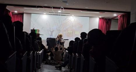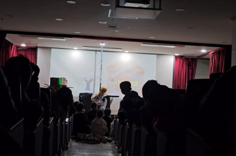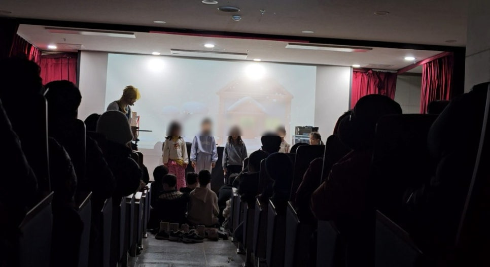 아이들이 의자에 앉으면 무대가 잘 보이지 않을 수 있다는 점을 미리 고려해 무대 앞 공간에 매트리스를 깔아주신 덕분에,