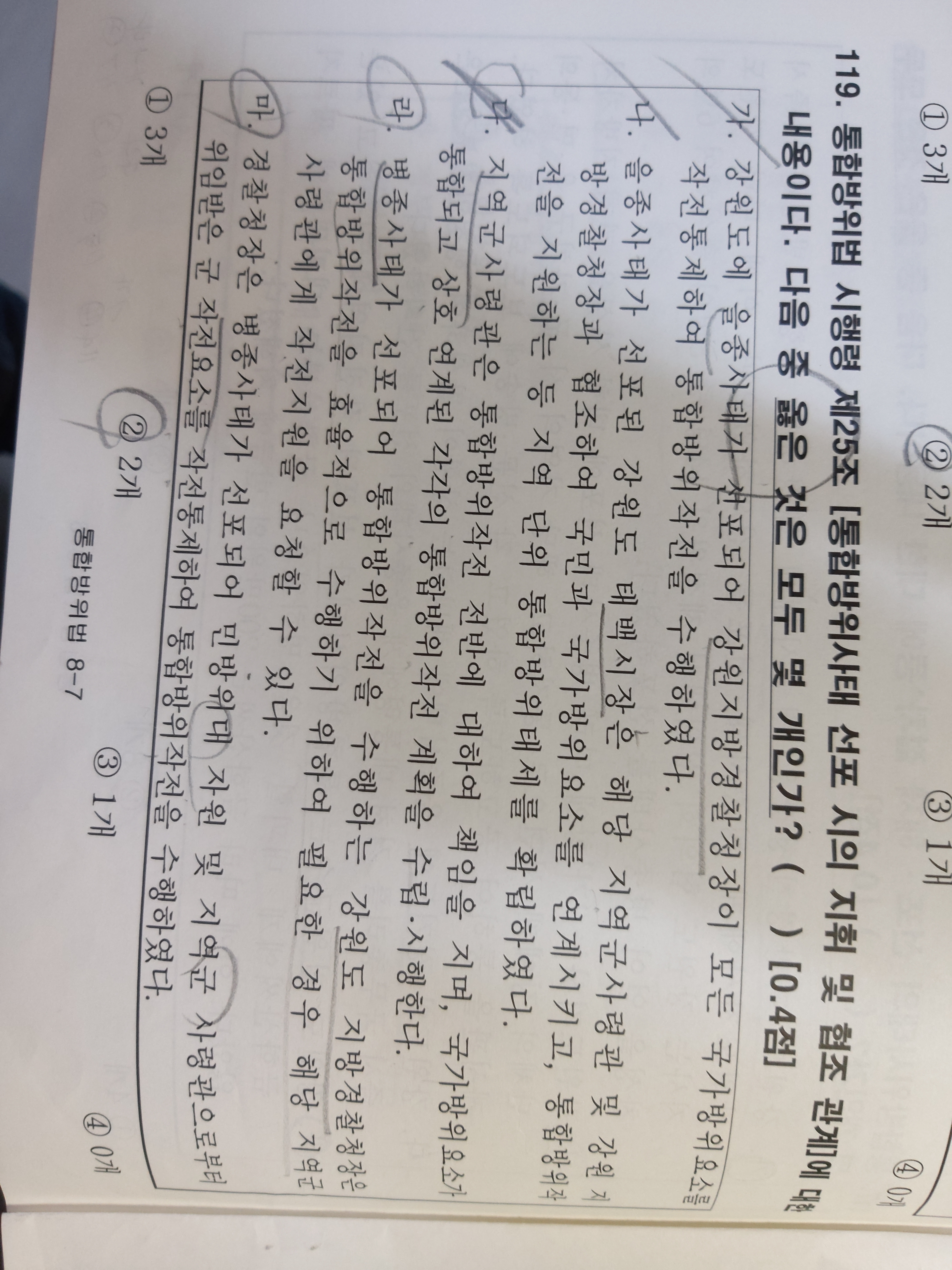 119번의 나항은 '태백시장은 지역군 사령관 및 강원지청장과 협조하여' 를 맞는 것으로 하였는데 이게 맞는 지문인가요?