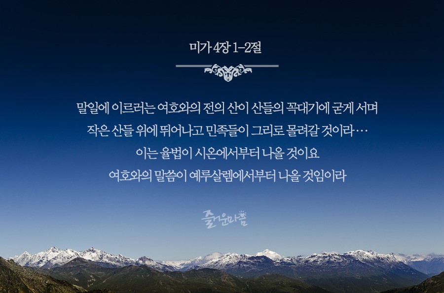미가 4장 1~2절 "말일에 이르러는 여호와의 전의 산이 산들의 꼭대기에 굳게 서며 작은 산들 위에 뛰어나고 민족들이 그리로 몰려 갈 것이라 곧 많은 이방이 가며 이르기를 오라 우리가 여호와의 산에 올라가서 야곱의 하나님의 전에 이르자 그가 그 도로 우리에게 가르치실 것이라 우리가 그 길로 행하리라 하리니 이는 율법이 시온에서부터 나올 것이요 여호와의 말씀이 예루살렘에 서부터 나올 것임이라 "