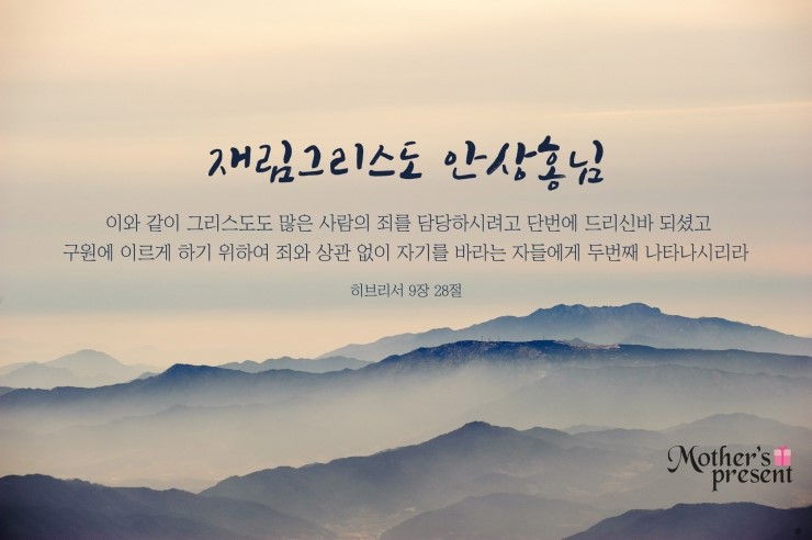 히 9장 28절 "이와 같이 그리스도도 많은 사람의 죄를 담당하시려고 단번에 드리신 바 되셨고 구원에 이르게 하기 위하여 죄와 상관없이 자기를 바라는 자들에게 두 번째 나타나시리라 "
