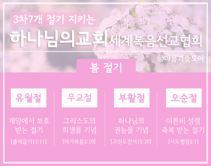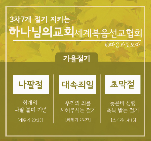 그 외에도 절기 마다 고유의 예언적인 의미와 이루어주실 하나님의 섭리가 그 속에 내포되어 있습니다 해마다 지켜야 할 절기(유월절, 무교절,부활절(초실절),오순절(칠칠절),나팔절.대속죄일,초막절) 있습니다(레23/1~38)
