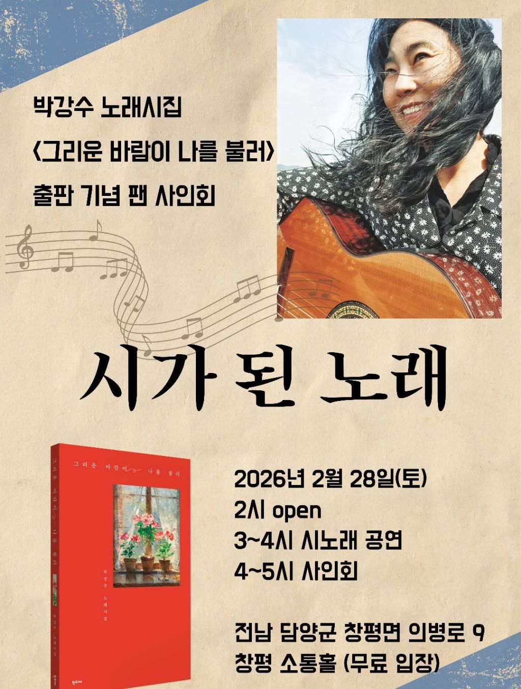 [행사]박강수 노래시집 출판기념 팬사인회 2026.02.28. 작성자Cricket|작성시간26.02.13|조회수156 목록 댓글 8 글자크기 작게가 글자크기 크게가 책 들고 달려가고 싶어라~새로 만든 '창평소통홀'도 보고 싶고요 ^^ 다음검색 현재 게시글 추가 기능 열기 북마크 공유하기 신고 센터로 신고 댓글 댓글 8 댓글쓰기 답글쓰기 댓글 리스트 작성자강여울(엘레강수) | 작성시간 26.02.13 new 작성자메아리 | 작성시간 26.02.13 new 와우 좋은 시간 되겠네요^^ 작성자뜬금이 | 작성시간 26.02.13 new 우리의 스타 작성자비탈 | 작성시간 26.02.13 new 우왕! 팬사인회~~~~ 작성자산청공주 | 작성시간 26.02.13 new 저두요 달려가고 싶어요 댓글 전체보기