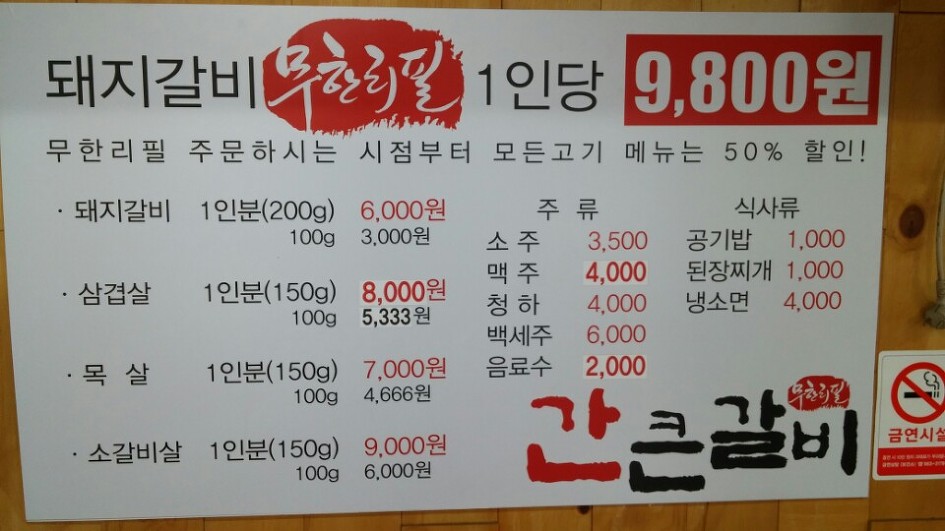 1인 9.800 원 돼지갈비 무한리필~