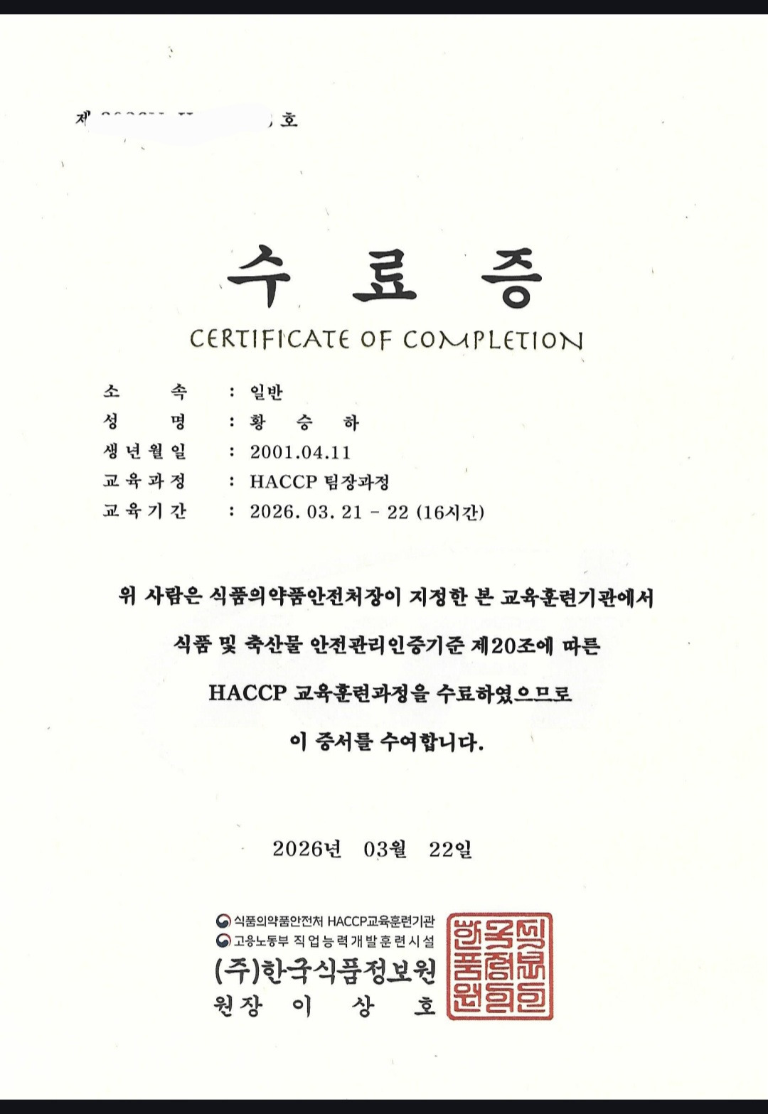 *교육명 : HACCP팀장(학생)