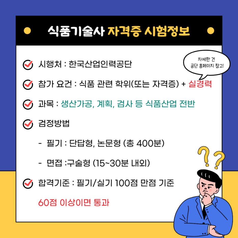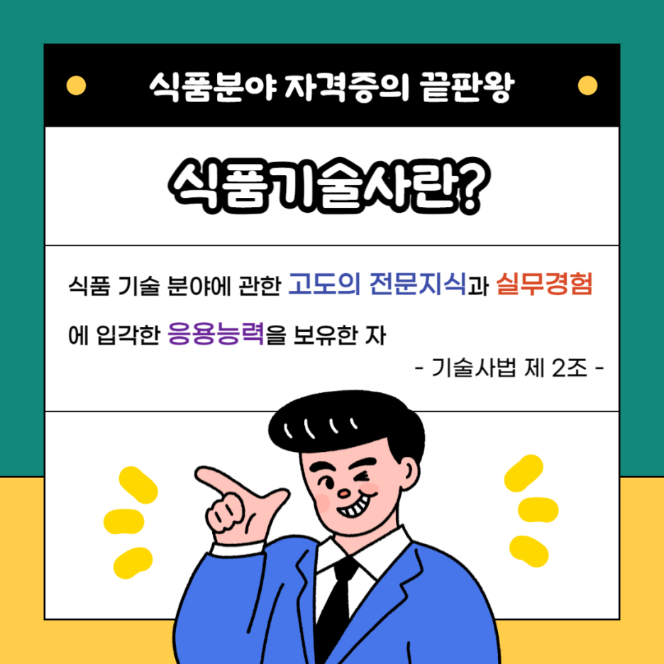 식품기술사란 고도의 전문지식 + 실무경험을 통해 응용할 수 있는 전문인력에게 주는 자격증입니다!