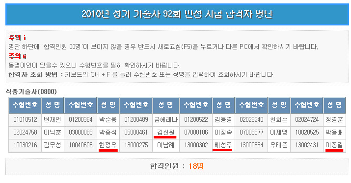 식품 기술사 최종 합격자 명단입니다.