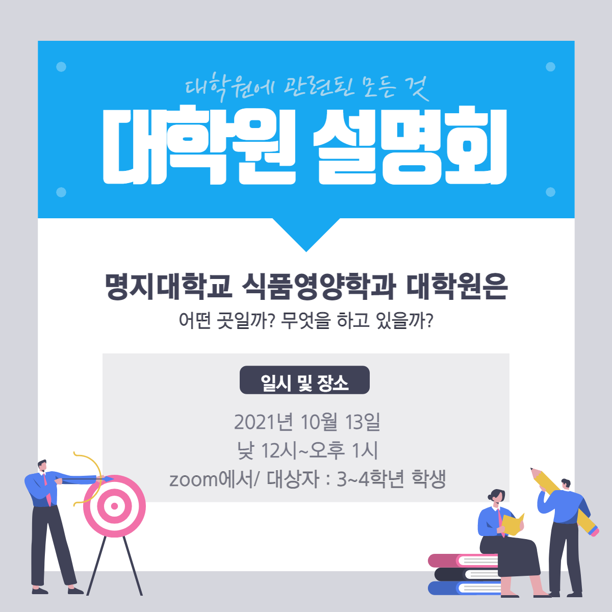 | 안녕하세요:) 이번 '대학원 설명회'는 대학원 진학을 고민하고 있는 3~4학년 학생들을 위해서 준비하였습니다. 평소 궁금하셨던 부분을 질문할 수 있는 기회로 대학원 진학에 관심이 있는 학생 식품연구원에 관심이 있는 학생 임상영양사가 되고 싶은 학생 우리과 대학원 시스템에 대해서 궁금한 학생 진로를 구체화하려고 고민 중인 분 대학원에 관한 구체적인 이야기를 듣고 싶은 분 등 많은 분들에게 도움이 될 거라고 생각됩니다. 일시 : 10월 13일 (수) 시간 : 오후 12시~오후 1시 참석대상 : 명지대학교 식품영양학과 학생(3-4학년) 장소: 온라인 (zoom) 줌 접속주소 : https://us02web.zoom.us/j/88094857749?pwd=OTdqWm9wWWk2eENBcUk4K2wrQUkyZz09 |