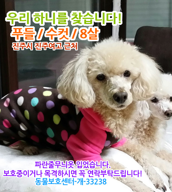 [실종신고]강아지를찾습니다/수컷/진주시 진주여고 근처 작성자동물보호센터|작성시간15.07.16|조회수49 목록 댓글 0 글자크기 작게가 글자크기 크게가 연갈색푸들(수컷)을 찾습니다!7월10일, 진주시 진주여고 근처 집에서 뛰쳐나갔어요. 파란줄무늬옷 입었구요, 겁이 많은 아이라 걱정입니다!! 친척집이라 길도 잘 몰라요. 보호중이신 분은 꼭 연락주세요!! 사례드립니다. 다음검색 현재 게시글 추가 기능 열기 북마크 공유하기 신고 센터로 신고 댓글 댓글 0 댓글쓰기 댓글 리스트