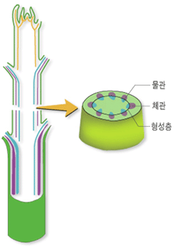 ① 물관: 형성층 안쪽에 위치하고, 뿌리에서 흡수한 물과 양분의 이동 통로이다. 죽은세포로 되어 있으며,위 아래 세포들 사이의 세포벽이 없어서 대롱처럼 연결되어 있다. ② 체관: 형성층 바깥쪽에 위치하고, 광합성 결과 만들어진 양분의 이동 통로이다. 살아 있는 세포로 되어 있으며, 위 아래 세포들 사이의 세포벽 에는 체같은 작은 구멍이 있다. ③ 형성층: 쌍떡잎 식물에서만 볼 수 있으며, 줄기(부피)생장을 한다.