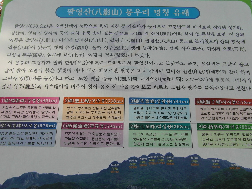 전라남도 고흥군 영남면과 점암면에 걸쳐 있는 높이 608m의 팔영산은 암릉산행지이자 바다산행으로 봄산행지로 제격이다. 본래 이름이 신증동국여지승람에는 팔전산(八顚山)으로 되어 있는데, 이는 중국 위왕의 세숫물에 팔봉이 비쳐 그 산세가 중국에까지 떨쳤다는 전설이 전해지면서 팔영산으로 바꿔 불렀다고 한다.