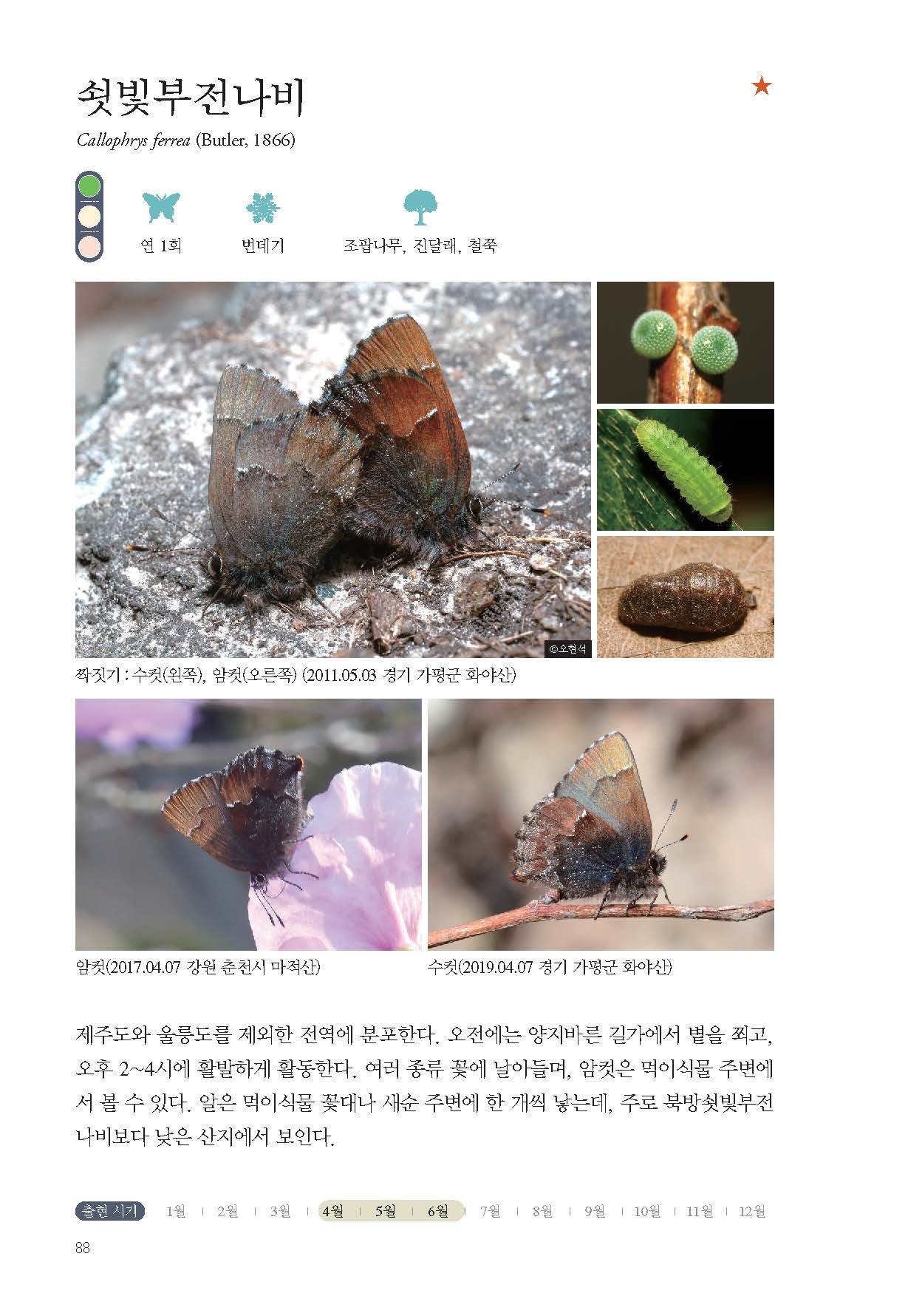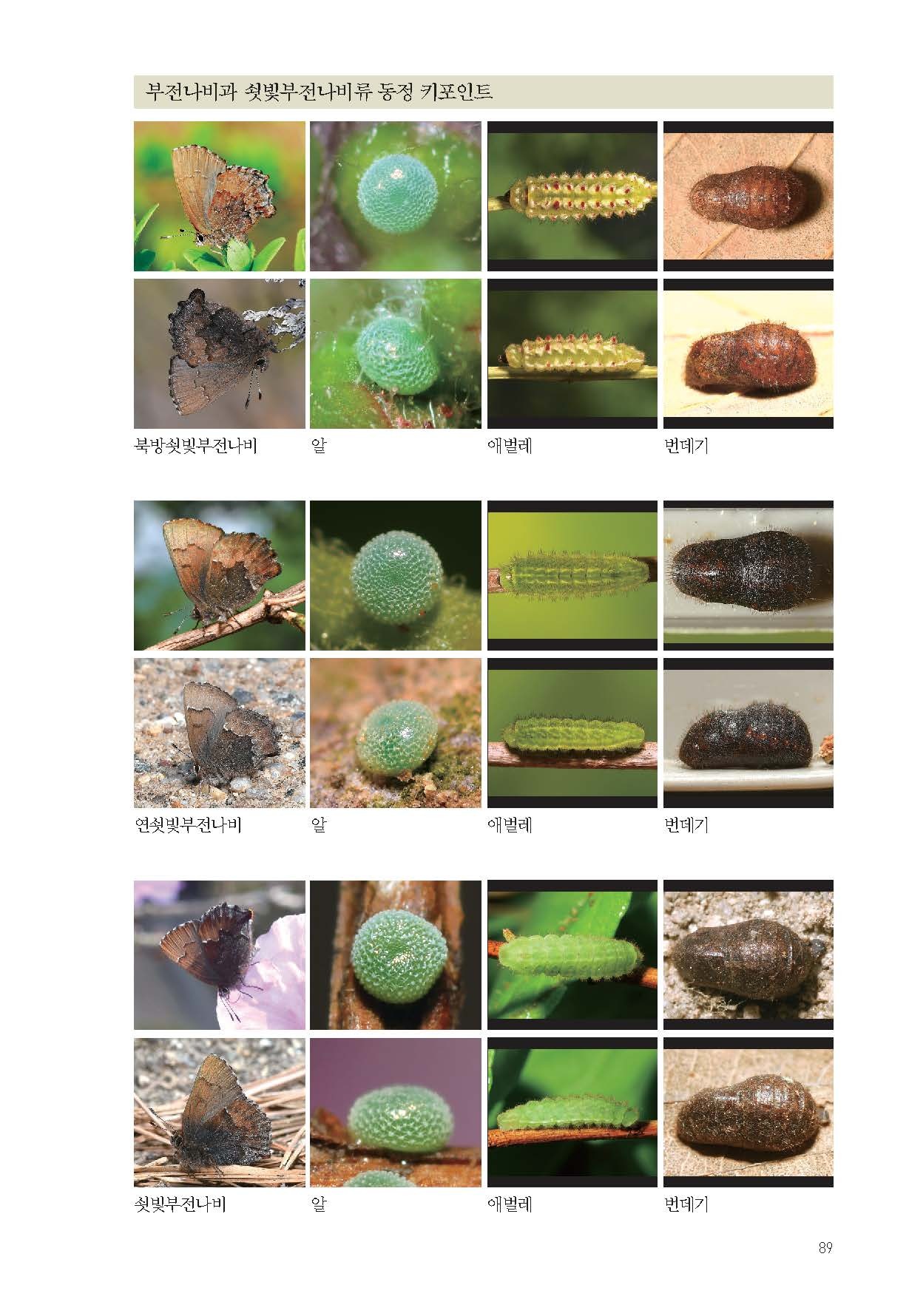 뾰족부전나비 50 바둑돌부전나비 51 남방남색꼬리부전나비 52 남방남색부전나비 53 쌍꼬리부전나비 54 선녀부전나비 55 붉은띠귤빛부전나비 56 금강산귤빛부전나비 57 민무늬귤빛부전나비 58 암고운부전나비 59 귤빛부전나비(루테아) 60 귤빛부전나비(아두스타) 61 시가도귤빛부전나비 62 참나무부전나비 63 긴꼬리부전나비 64 물빛긴꼬리부전나비 65 담색긴꼬리부전나비 66 깊은산부전나비 67 작은녹색부전나비 68 남방녹색부전나비 69 북방녹색부전나비 70 암붉은점녹색부전나비 71 은날개녹색부전나비 72 검정녹색부전나비 73 큰녹색부전나비 74 깊은산녹색부전나비 75 금강석녹색부전나비 76 넓은띠녹색부전나비 77 산녹색부전나비 78 우리녹색부전나비 79 부전나비과 녹색부전나비아과 동정 키포인트 80 부전나비과 녹색부전나비류 동정 키포인트 82 북방쇳빛부전나비 86 연쇳빛부전나비(신칭) 87 쇳빛부전나비 88 부전나비과 쇳빛부전나비류 동정 키포인트 89 범부전나비 90 울릉범부전나비 91 민꼬리까마귀부전나비 92 까마귀부전나비 93 참까마귀부전나비 94 북방까마귀부전나비 95 꼬마까마귀부전나비 96 벚나무까마귀부전나비 97 부전나비과 까마귀부전나비류 동정 키포인트 98 작은주홍부전나비 100 큰주홍부전나비 101 물결부전나비 102 남색물결부전나비 103 극남부전나비 104 남방부전나비 105 산푸른부전나비 106 푸른부전나비 107 회령푸른부전나비 108 범부전나비류, 부전나비아과 동정 키포인트 109 암먹부전나비 110 먹부전나비 111 작은홍띠점박이푸른부전나비 112 큰홍띠점박이푸른부전나비 113 산꼬마부전나비 114 산부전나비 115 부전나비 116 소철꼬리부전나비 117 북방점박이푸른부전나비 118 고운점박이푸른부전나비 119 큰점박이푸른부전나비 120 담흑부전나비 121 부전나비과 동정 키포인트 122