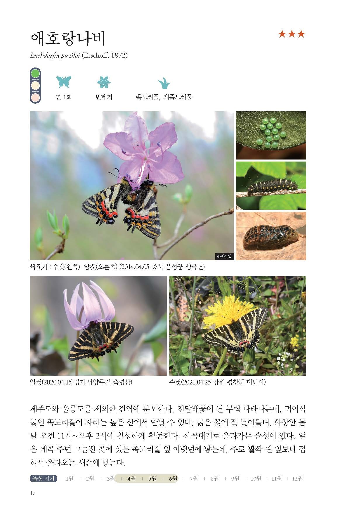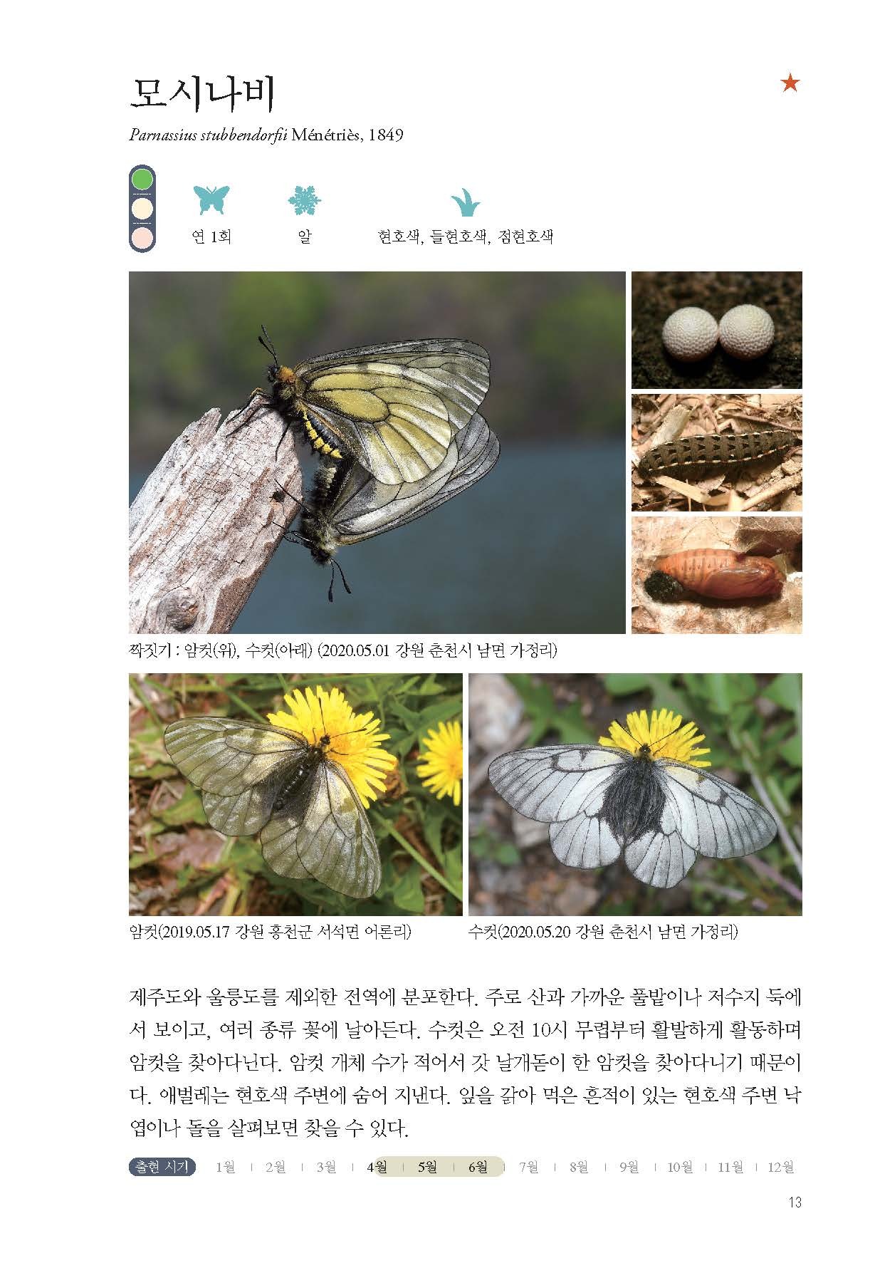 애호랑나비 12 모시나비 13 붉은점모시나비 14 꼬리명주나비 15 사향제비나비 16 호랑나비 17 산호랑나비 18 산호랑나비(제주) 19 긴꼬리제비나비 20 남방제비나비 21 제비나비 22 산제비나비 23 무늬박이제비나비 24 멤논제비나비 25 청띠제비나비 26 호랑나비과·호랑나비아과 동정 키포인트 27