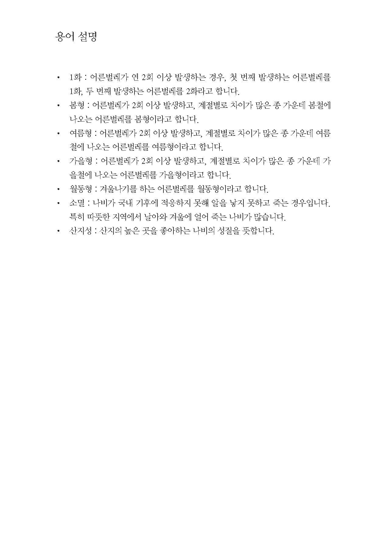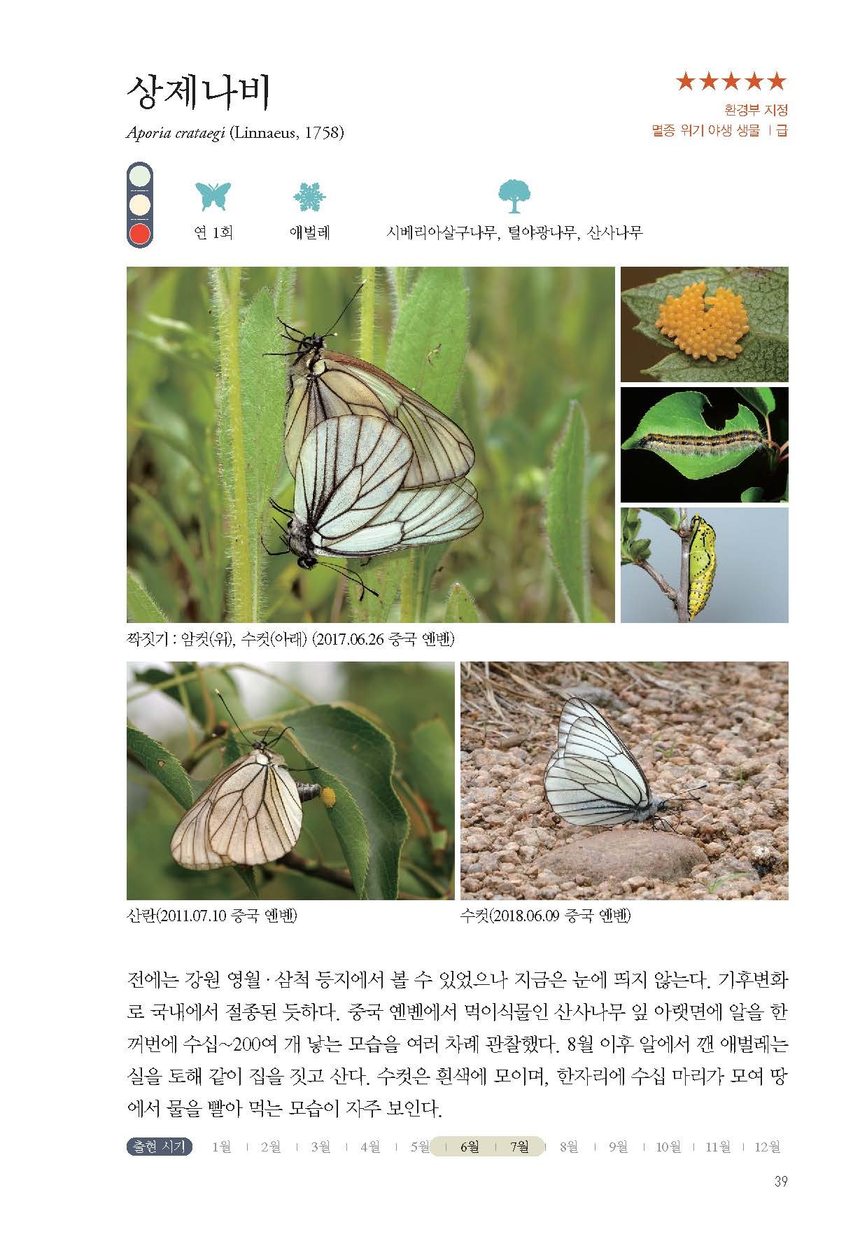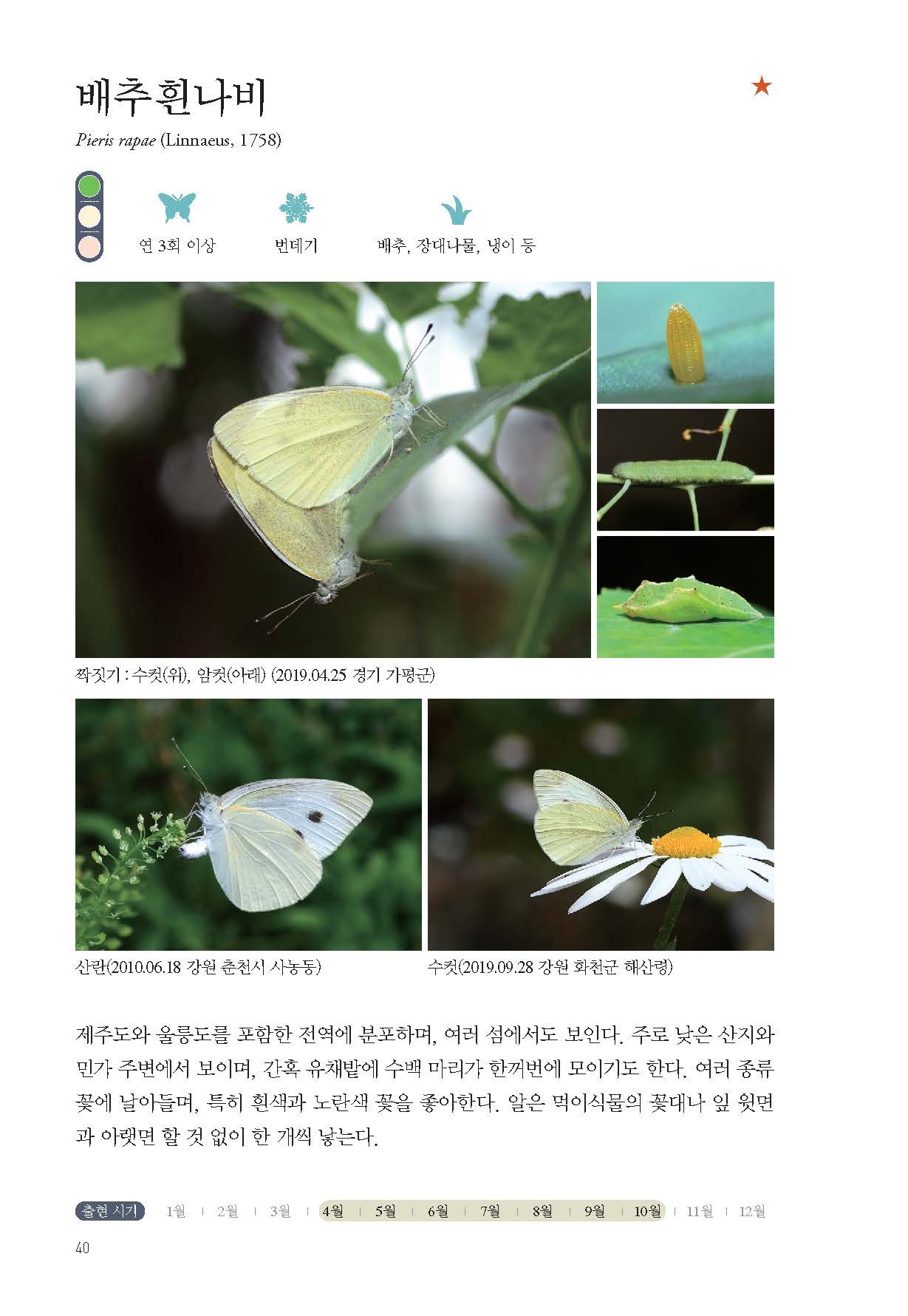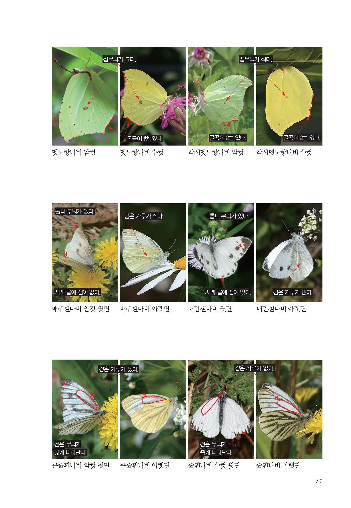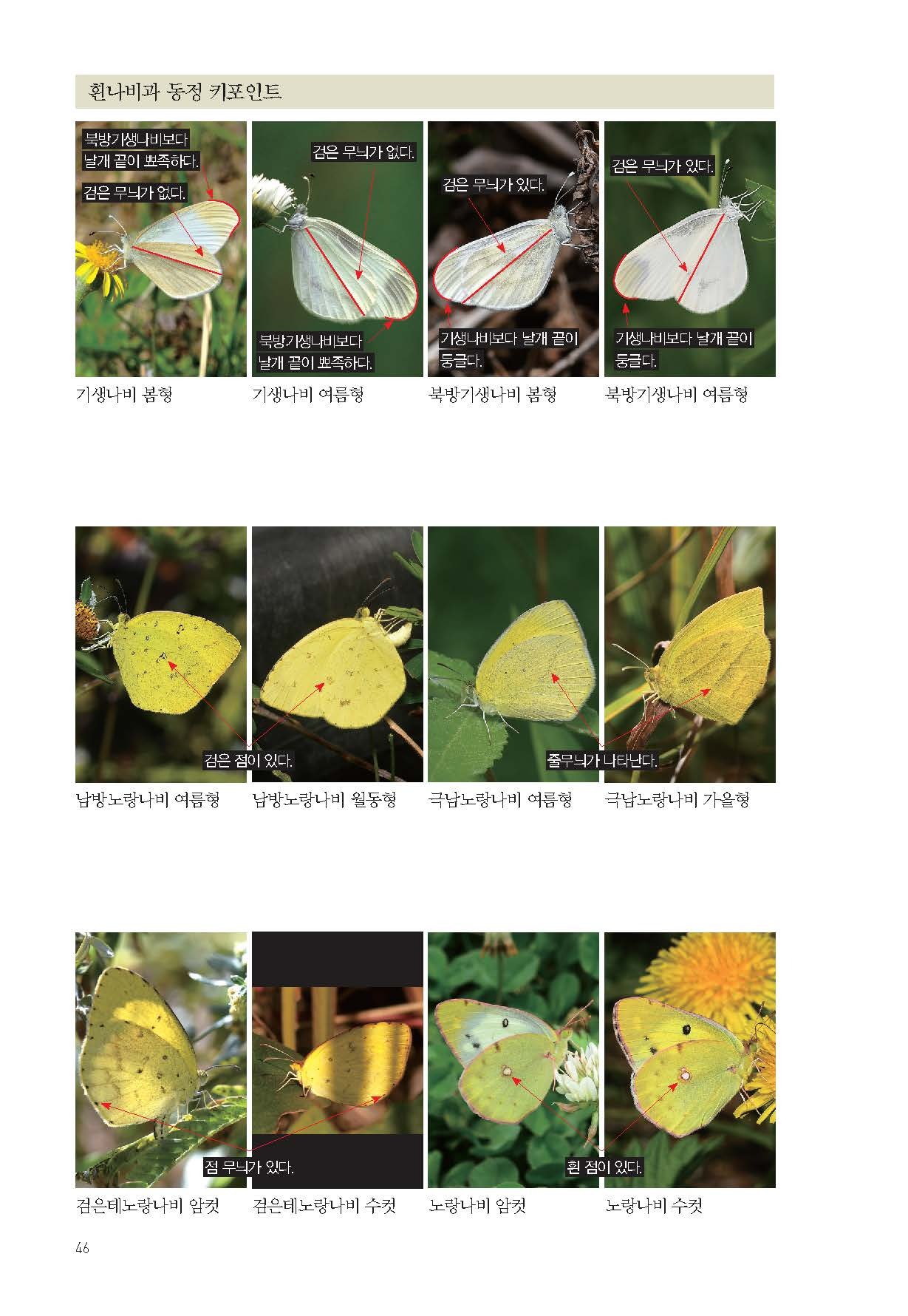 기생나비 30 북방기생나비 31 남방노랑나비 32 극남노랑나비 33 검은테노랑나비 34 노랑나비 35 멧노랑나비 36 각시멧노랑나비 37 갈고리흰나비 38 상제나비 39 배추흰나비 40 대만흰나비 41 큰줄흰나비 42 줄흰나비 43 연노랑흰나비 44 풀흰나비 45 흰나비과 동정 키포인트 46