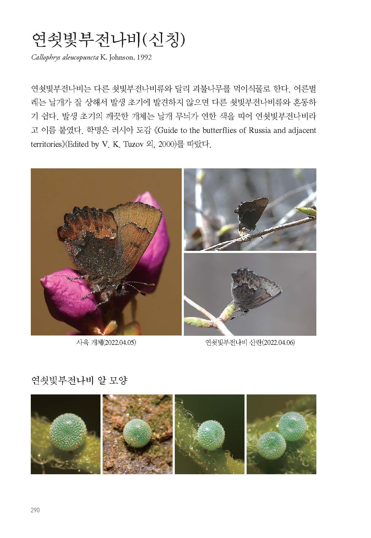 연쇳빛부전나비(신칭) 290 북방은점표범나비(신칭) 292 한라은점표범나비 292 산호랑나비 294 귤빛부전나비 295 참산뱀눈나비와 함경산뱀눈나비 298 범부전나비와 울릉범부전나비 299