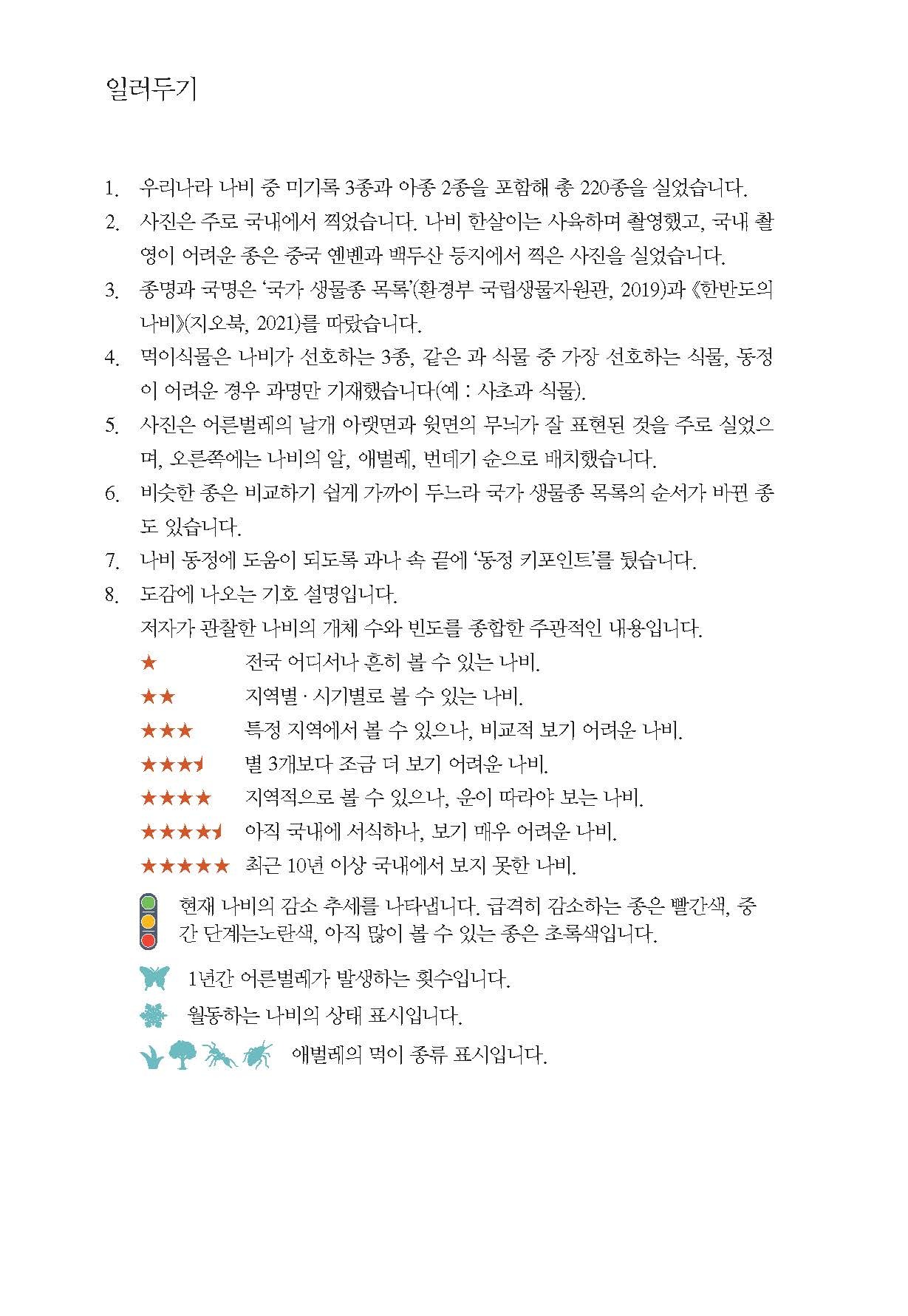 드디어 30년 동안 나비를 찾아다니고, 208종을 사육하며 연구한 자료를 집대성해서 내놓는다. 미기록 3종을 포함해 한국 나비 220종을 생태 사진 1900여 컷으로 소개한다. 알, 애벌레, 번데기 사진을 함께 실었고, 사진을 찍은 날짜와 장소 등 서식지 정보를 밝혔다. 과나 속 끝에는 나비 동정에 도움이 되도록 ‘동정 키포인트’를 두었다. 관찰 개체 수와 빈도를 별 개수(1~5개)로 나타냈고, 그밖에 감소 추세와 발생 횟수, 월동태, 먹이식물, 발생 시기 등 다양한 정보를 기호로 나타내 초보자도 직관적으로 알 수 있게 구성했다.