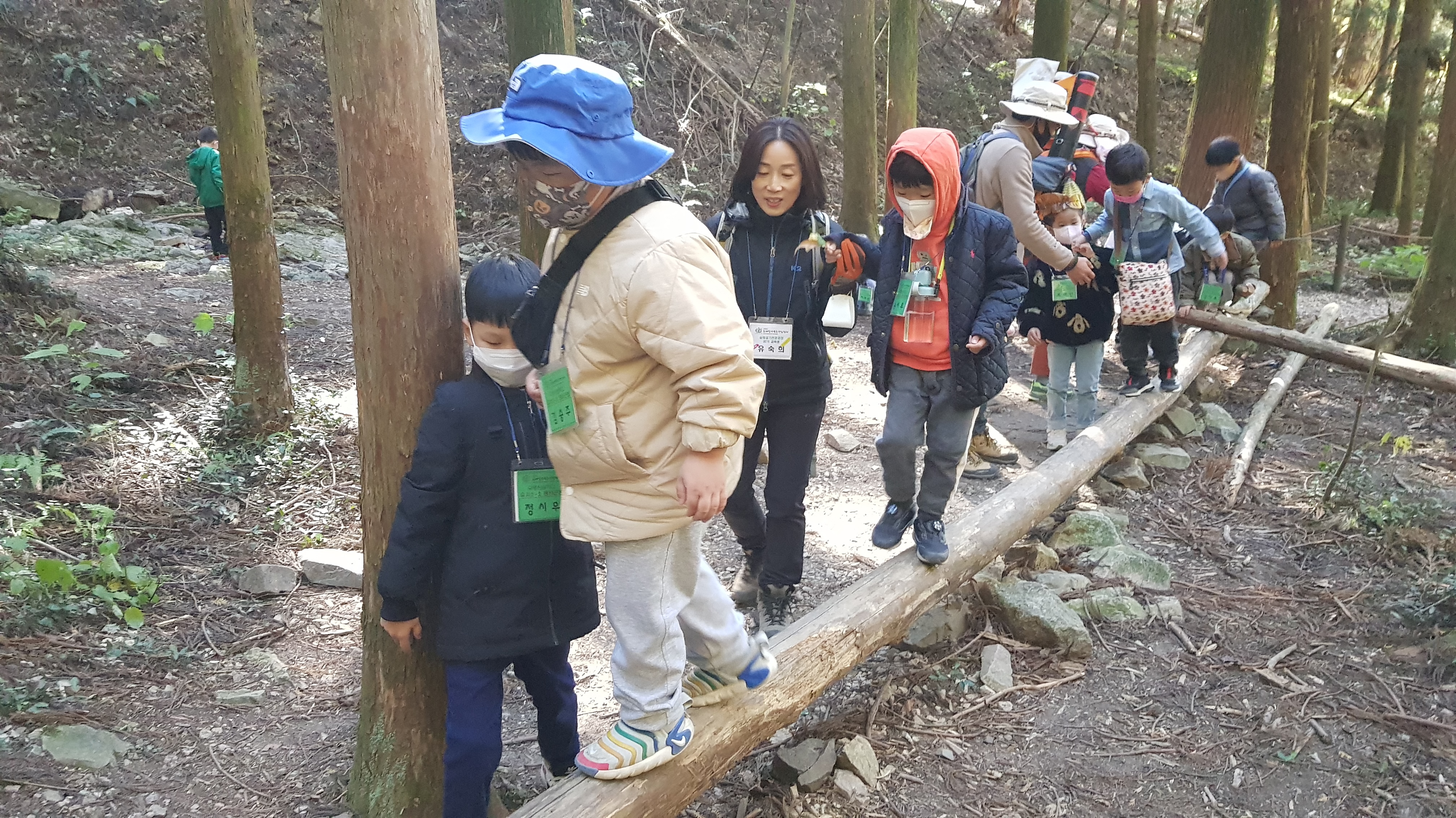 통나무 다리를 걸을땐 살금살금 친구손을 꼭 잡고 의지하며 건너보고