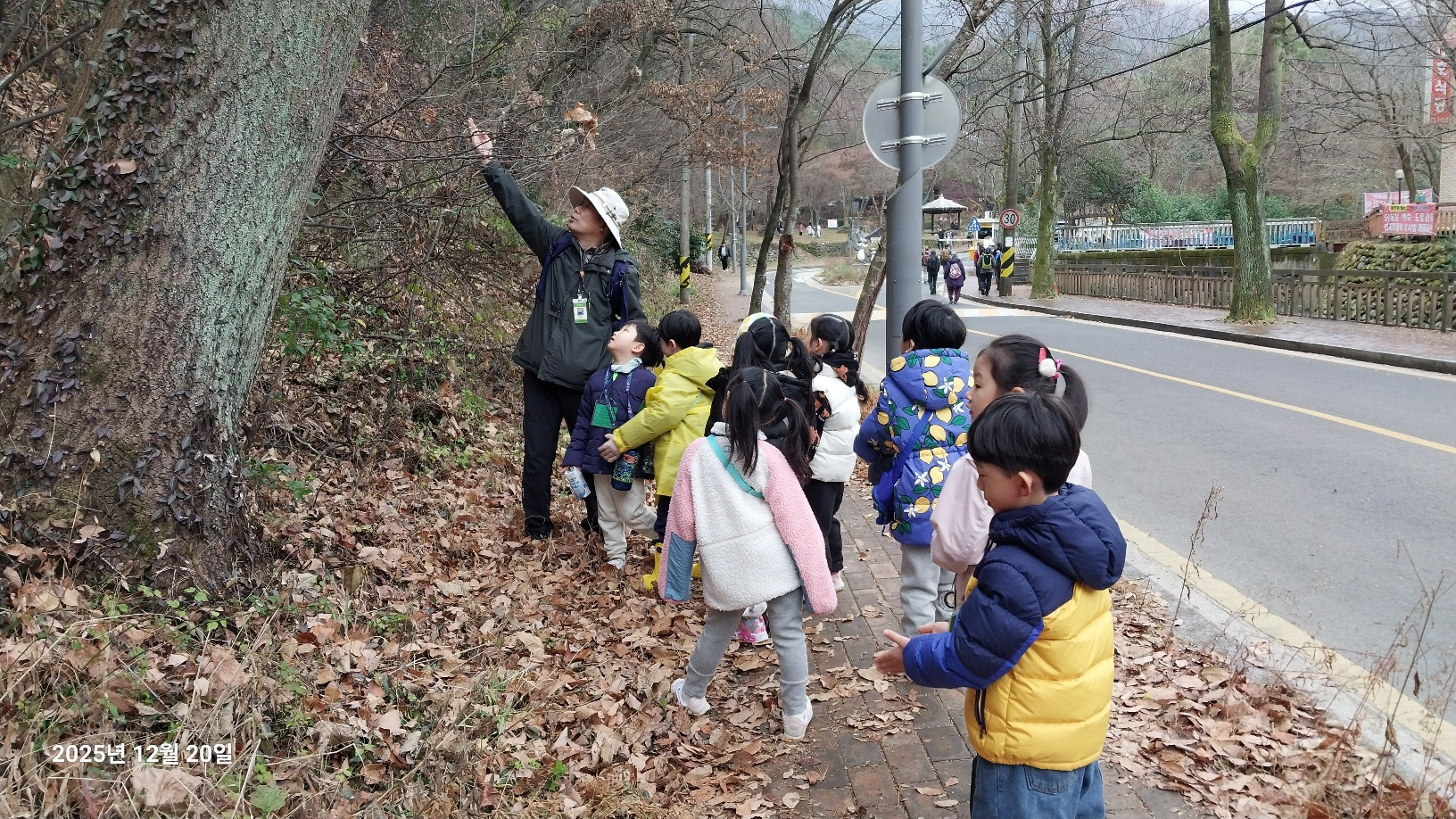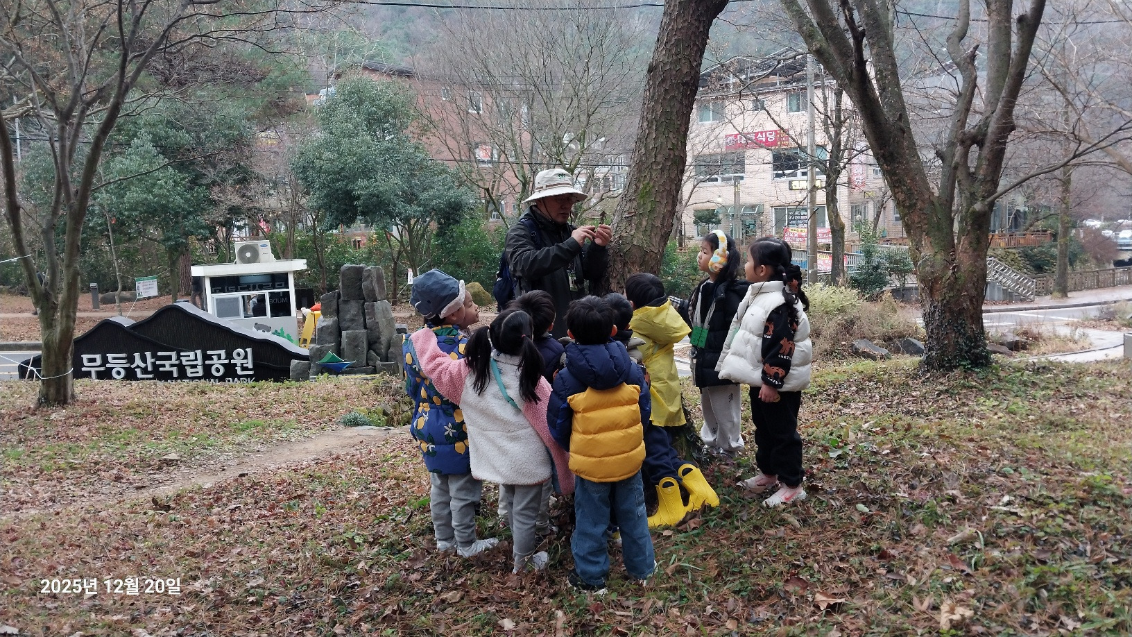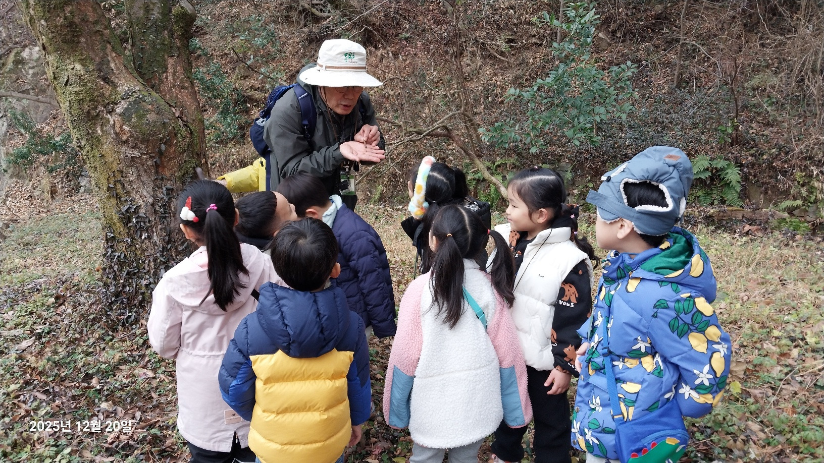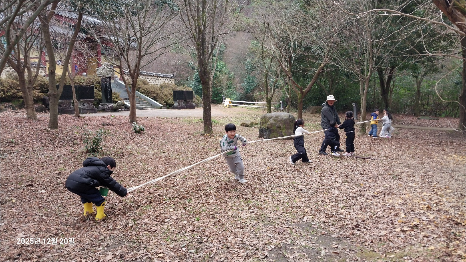 나무와 동물 등 무등산은 겨울을 어떻게 준비하고 있을까요? 낙엽수와 상록수에 대해 알아보고 겨울잠을 자는 동물, 겨울잠을 자지 않는 동물도 알아봅니다. 선생님께 루페 사용법을 배운 후 각자 목에 걸고 다니면서 나무의 겨울눈, 곤충, 지의류 등을 관찰했습니다. 탱자나무에 대롱대롱 매달린 번데기와 청미래덩굴의 빨간 열매, 찔레 열매, 보랏빛 작살나무 열매 등 여러 가지 열매도 봤습니다. 나무 조각을 주워서 어떤 모양인지 살펴보고 솔방울과 낙엽으로 꾸미기 활동도 해봅니다. 작고 귀여운 손으로 열심히 작품을 만들었어요. 낙엽을 주워 양파망에 담아 낙엽공도 직접 만들어 보았어요. 낙엽공으로 축구를 했는데 우리 친구들이 만들어서 더 재미있었죠? 그 후 종가시나무의 열매인 도토리를 주워서 도토리를 멀리 보내주기도 했습니다. 도토리를 한 개 한 개 줍는 표정들이 참 즐거워 보였습니다. 줍는 재미를 느낀것 같아요. ㅎ 지난 달부터 꼭 하고 싶어했던 줄다리기도 드디어 했습니다. 영~차 영~차 서로 이기고 싶어서 손이 빨개질 때까지 최선을 다했습니다. 빨개진 손은 보조 선생님이 호~하고 불어주었습니다.