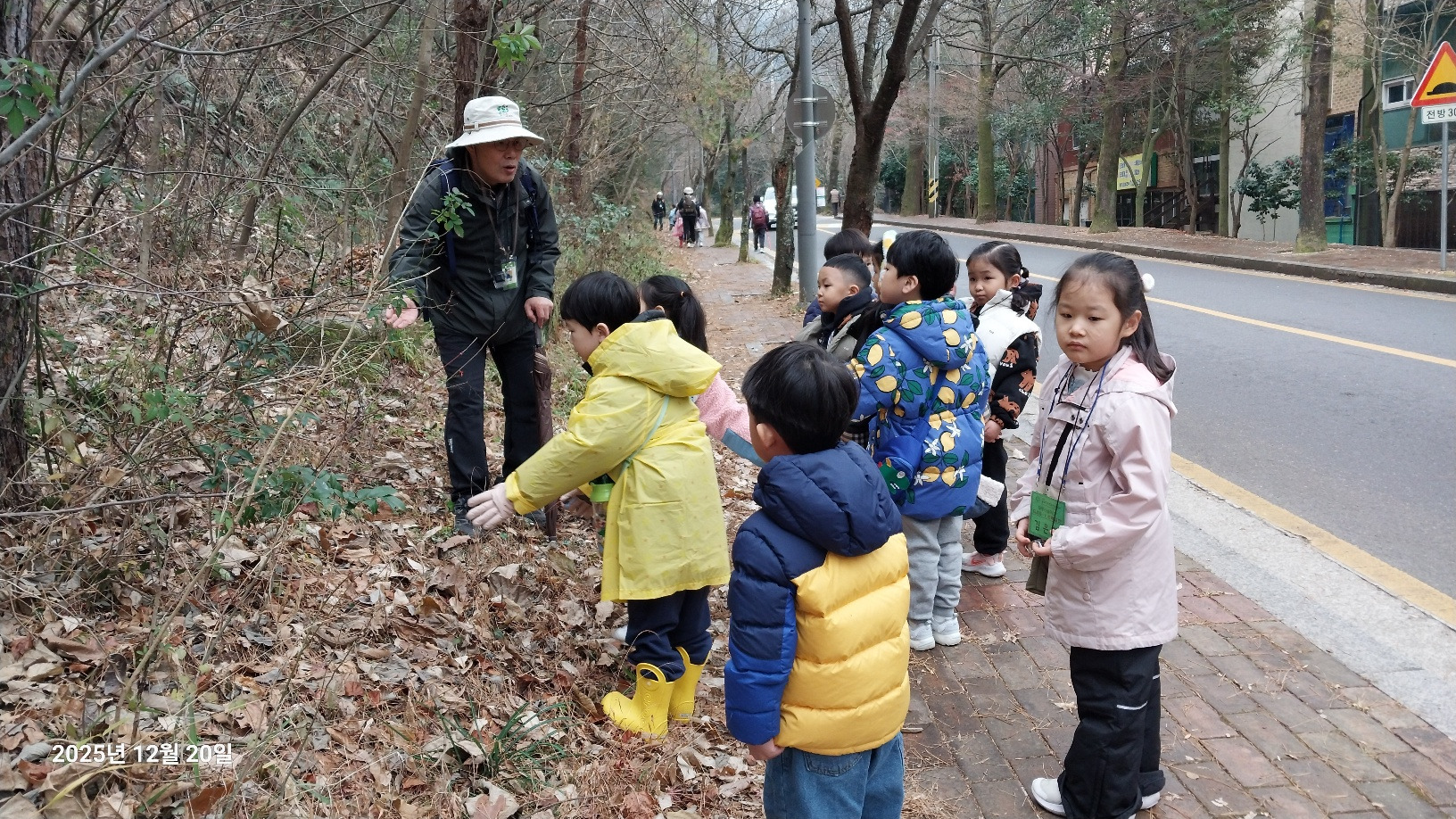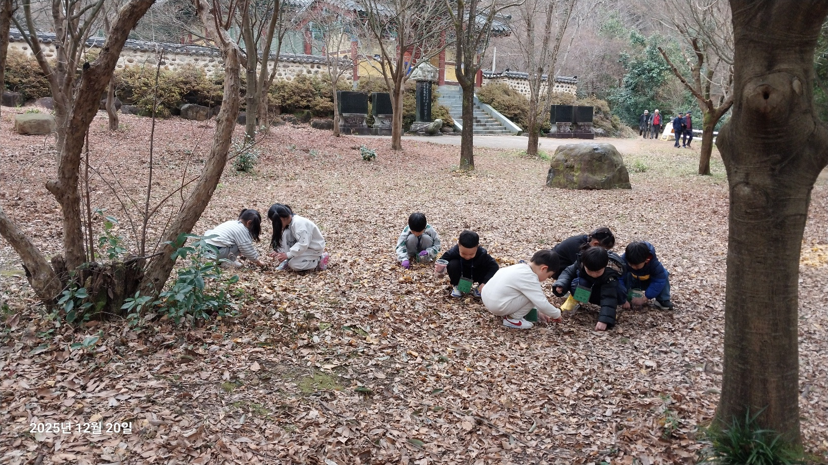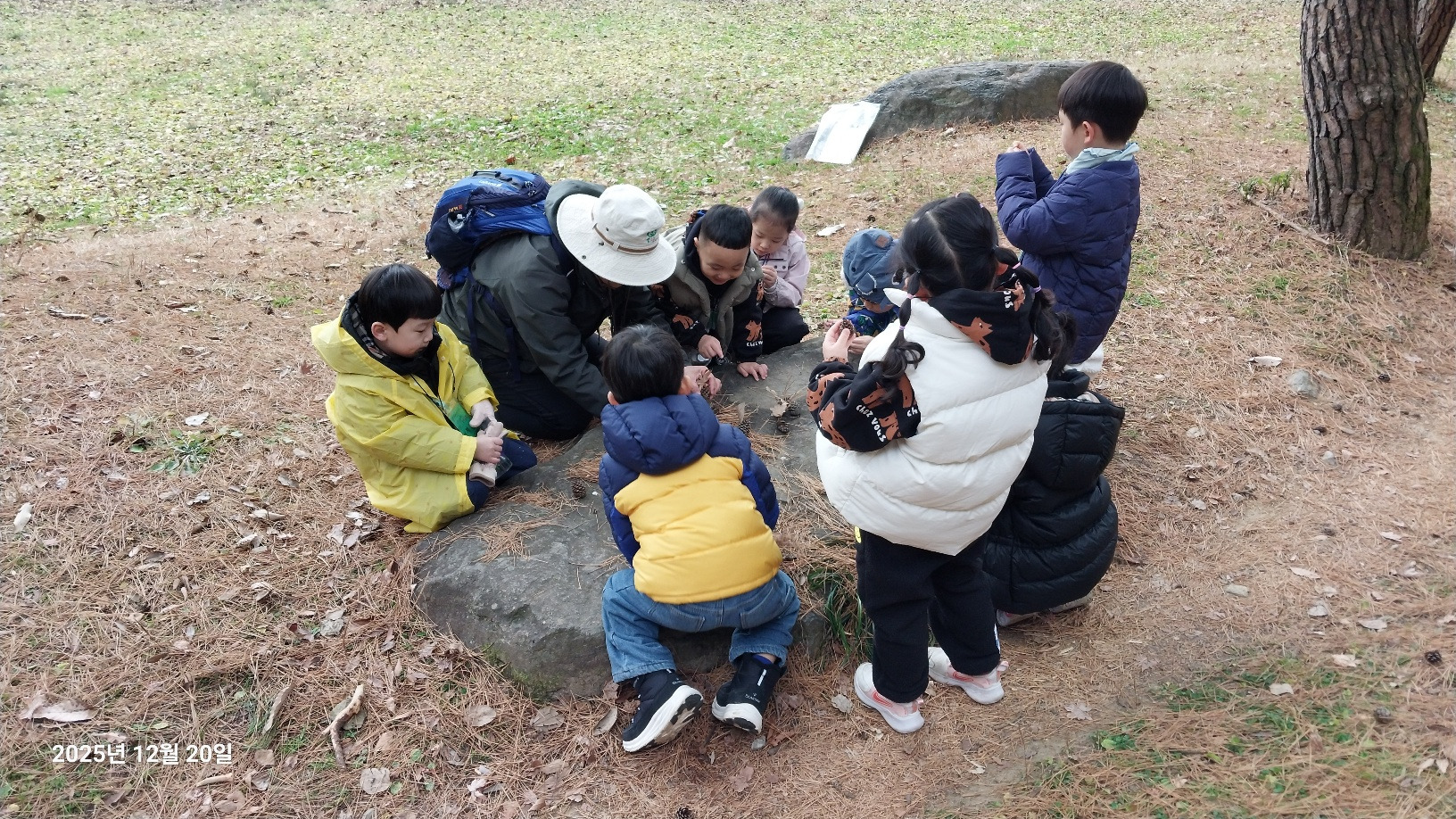 나무와 동물 등 무등산은 겨울을 어떻게 준비하고 있을까요? 낙엽수와 상록수에 대해 알아보고 겨울잠을 자는 동물, 겨울잠을 자지 않는 동물도 알아봅니다. 선생님께 루페 사용법을 배운 후 각자 목에 걸고 다니면서 나무의 겨울눈, 곤충, 지의류 등을 관찰했습니다. 탱자나무에 대롱대롱 매달린 번데기와 청미래덩굴의 빨간 열매, 찔레 열매, 보랏빛 작살나무 열매 등 여러 가지 열매도 봤습니다. 나무 조각을 주워서 어떤 모양인지 살펴보고 솔방울과 낙엽으로 꾸미기 활동도 해봅니다. 작고 귀여운 손으로 열심히 작품을 만들었어요. 낙엽을 주워 양파망에 담아 낙엽공도 직접 만들어 보았어요. 낙엽공으로 축구를 했는데 우리 친구들이 만들어서 더 재미있었죠? 그 후 종가시나무의 열매인 도토리를 주워서 도토리를 멀리 보내주기도 했습니다. 도토리를 한 개 한 개 줍는 표정들이 참 즐거워 보였습니다. 줍는 재미를 느낀것 같아요. ㅎ 지난 달부터 꼭 하고 싶어했던 줄다리기도 드디어 했습니다. 영~차 영~차 서로 이기고 싶어서 손이 빨개질 때까지 최선을 다했습니다. 빨개진 손은 보조 선생님이 호~하고 불어주었습니다.