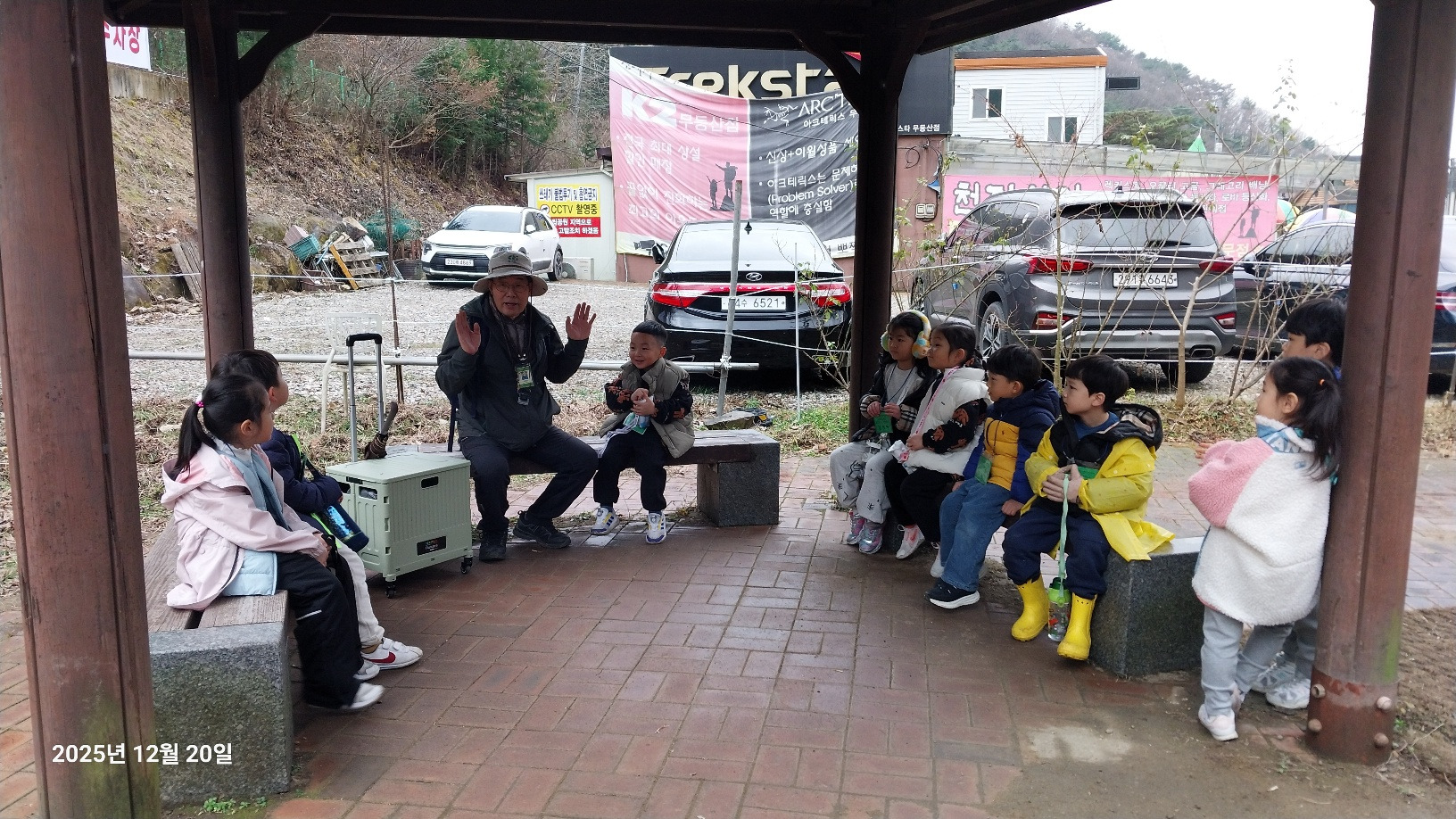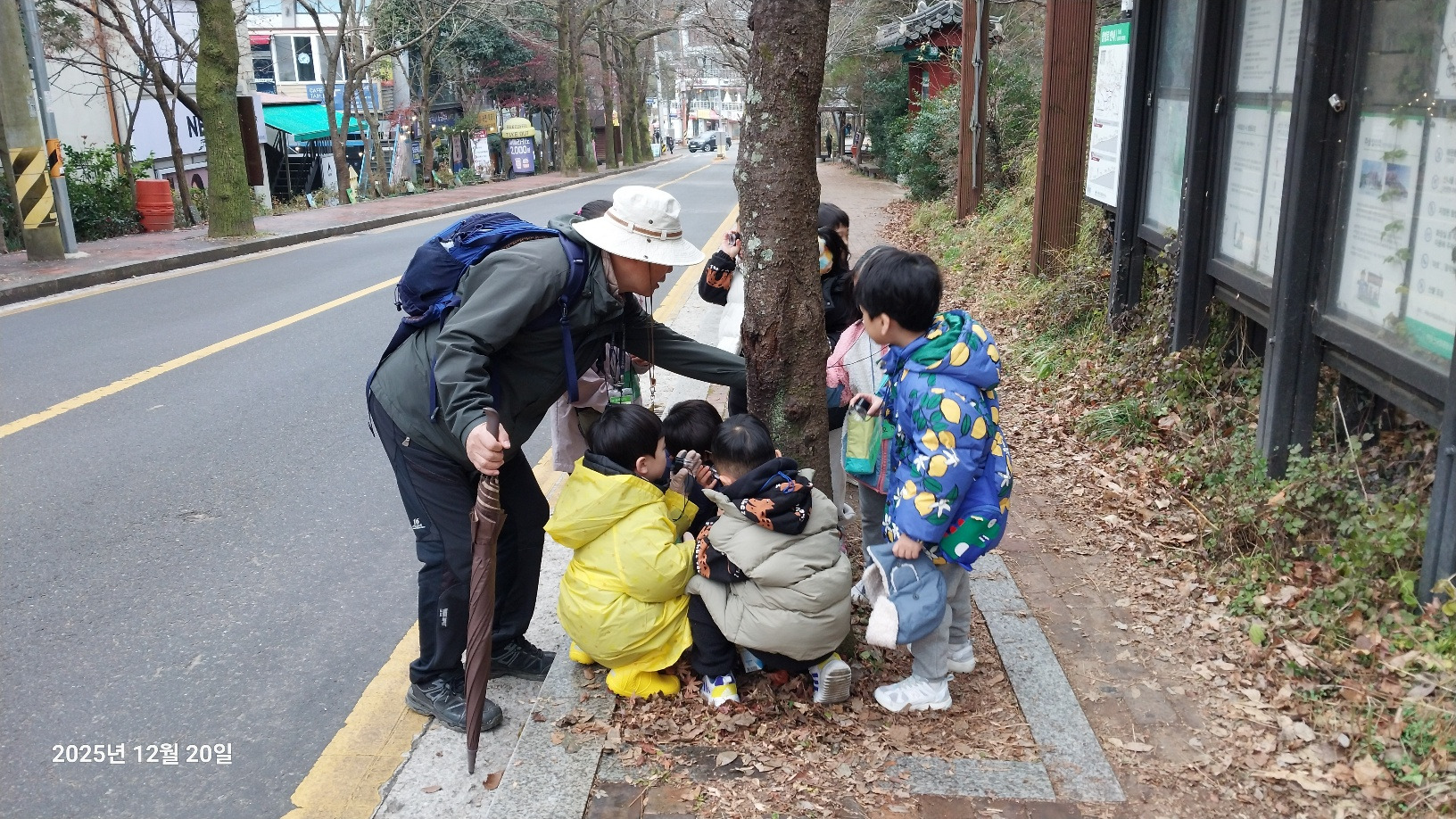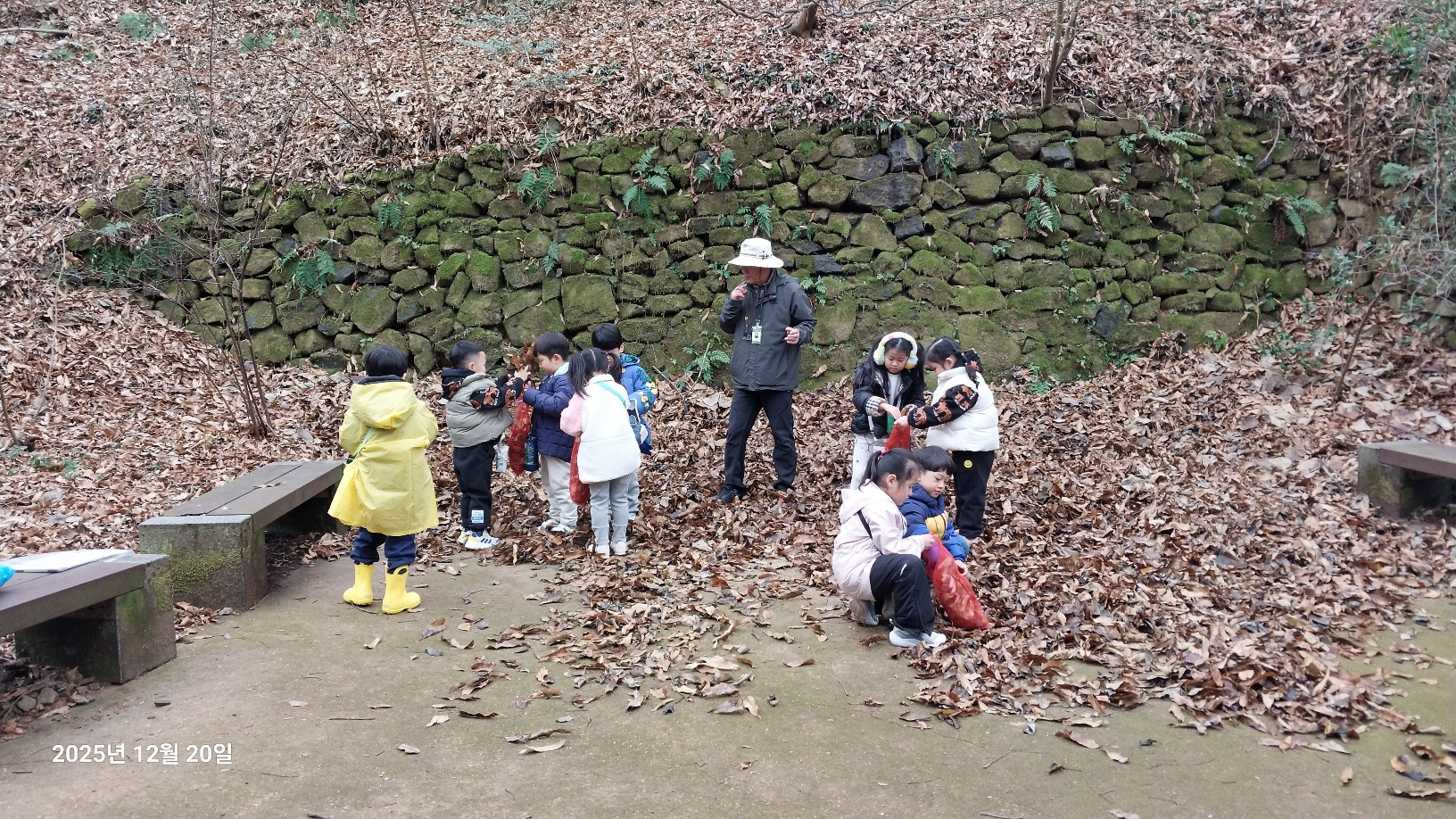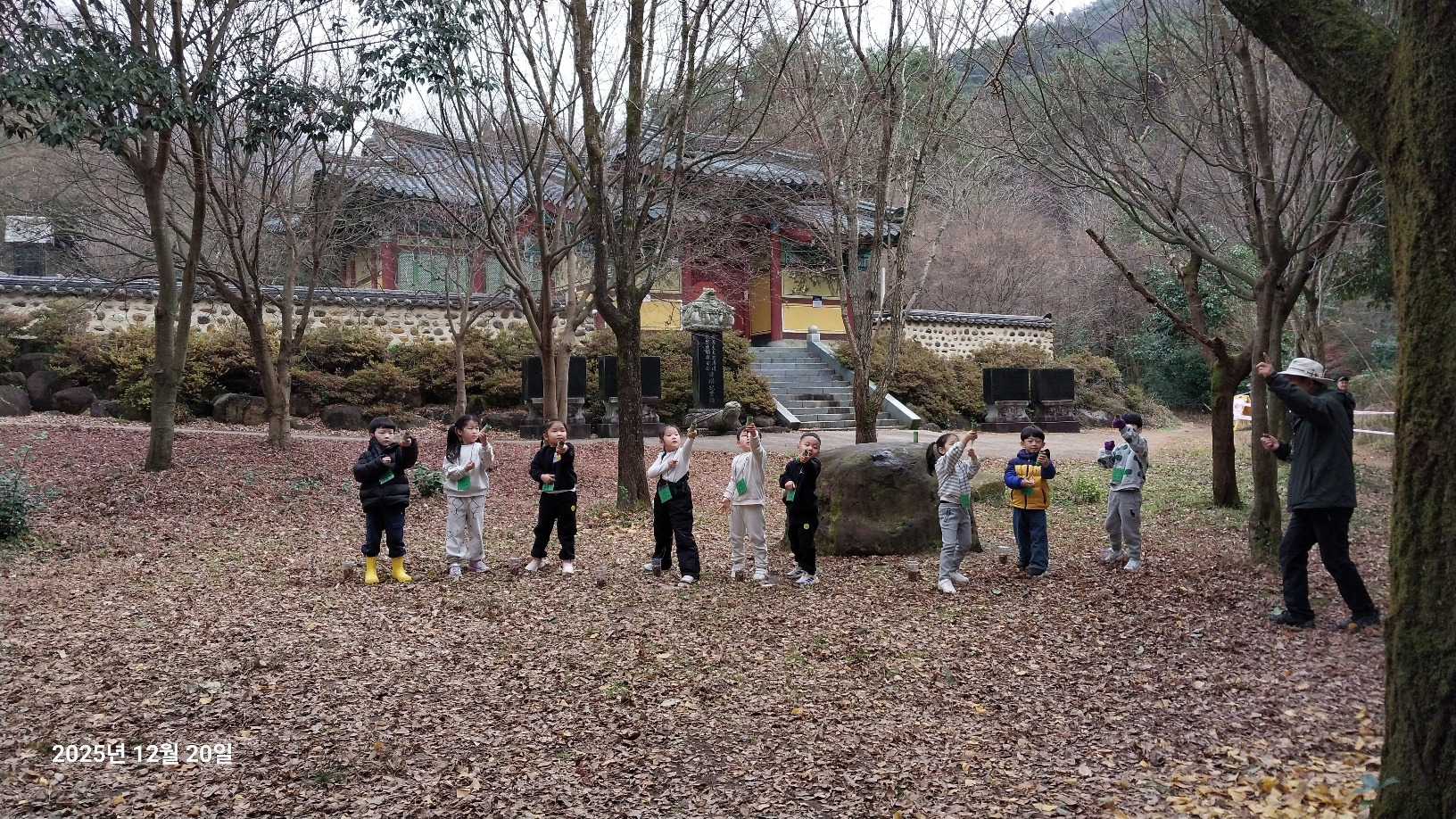 나무와 동물 등 무등산은 겨울을 어떻게 준비하고 있을까요? 낙엽수와 상록수에 대해 알아보고 겨울잠을 자는 동물, 겨울잠을 자지 않는 동물도 알아봅니다. 선생님께 루페 사용법을 배운 후 각자 목에 걸고 다니면서 나무의 겨울눈, 곤충, 지의류 등을 관찰했습니다. 탱자나무에 대롱대롱 매달린 번데기와 청미래덩굴의 빨간 열매, 찔레 열매, 보랏빛 작살나무 열매 등 여러 가지 열매도 봤습니다. 나무 조각을 주워서 어떤 모양인지 살펴보고 솔방울과 낙엽으로 꾸미기 활동도 해봅니다. 작고 귀여운 손으로 열심히 작품을 만들었어요. 낙엽을 주워 양파망에 담아 낙엽공도 직접 만들어 보았어요. 낙엽공으로 축구를 했는데 우리 친구들이 만들어서 더 재미있었죠? 그 후 종가시나무의 열매인 도토리를 주워서 도토리를 멀리 보내주기도 했습니다. 도토리를 한 개 한 개 줍는 표정들이 참 즐거워 보였습니다. 줍는 재미를 느낀것 같아요. ㅎ 지난 달부터 꼭 하고 싶어했던 줄다리기도 드디어 했습니다. 영~차 영~차 서로 이기고 싶어서 손이 빨개질 때까지 최선을 다했습니다. 빨개진 손은 보조 선생님이 호~하고 불어주었습니다.
