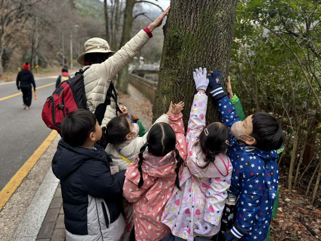 나무를 만져보고, 더 높이 뻗은 가지 끝에 닿고 싶어 두 팔을 쭉 뻗어보는 아이들.
