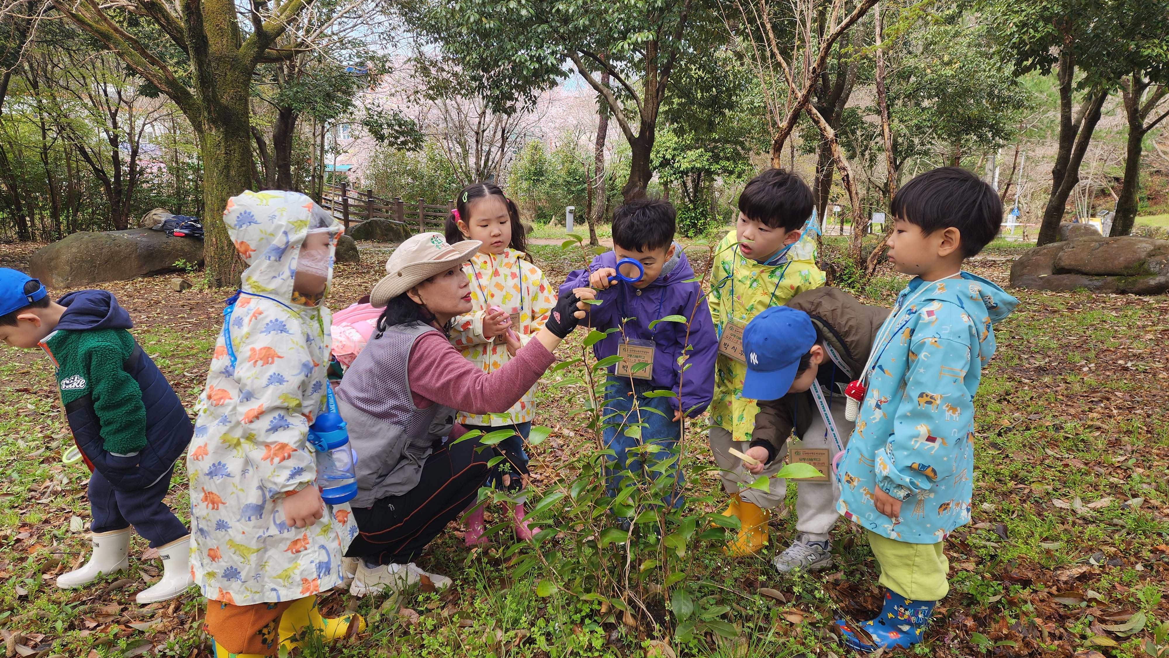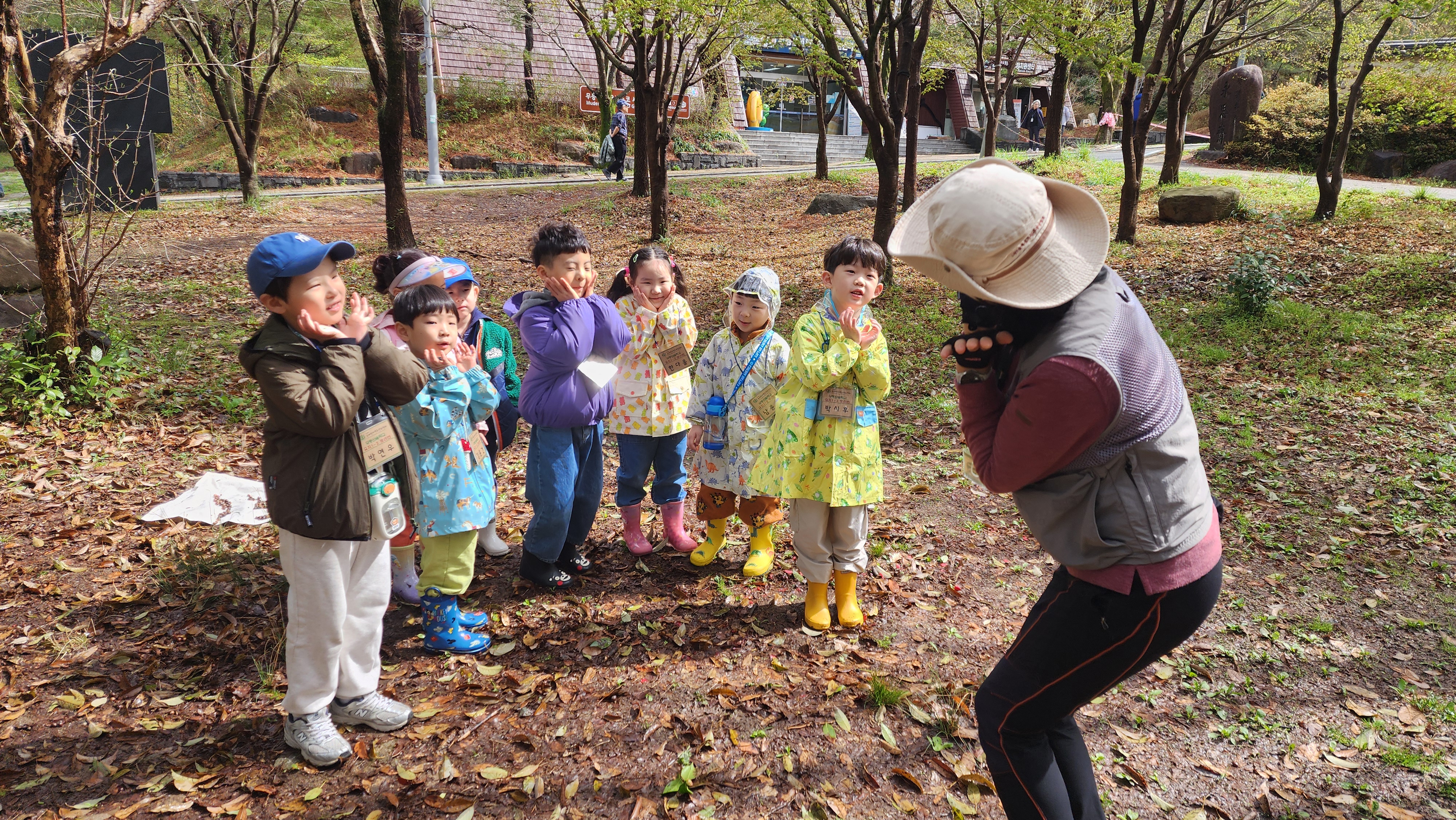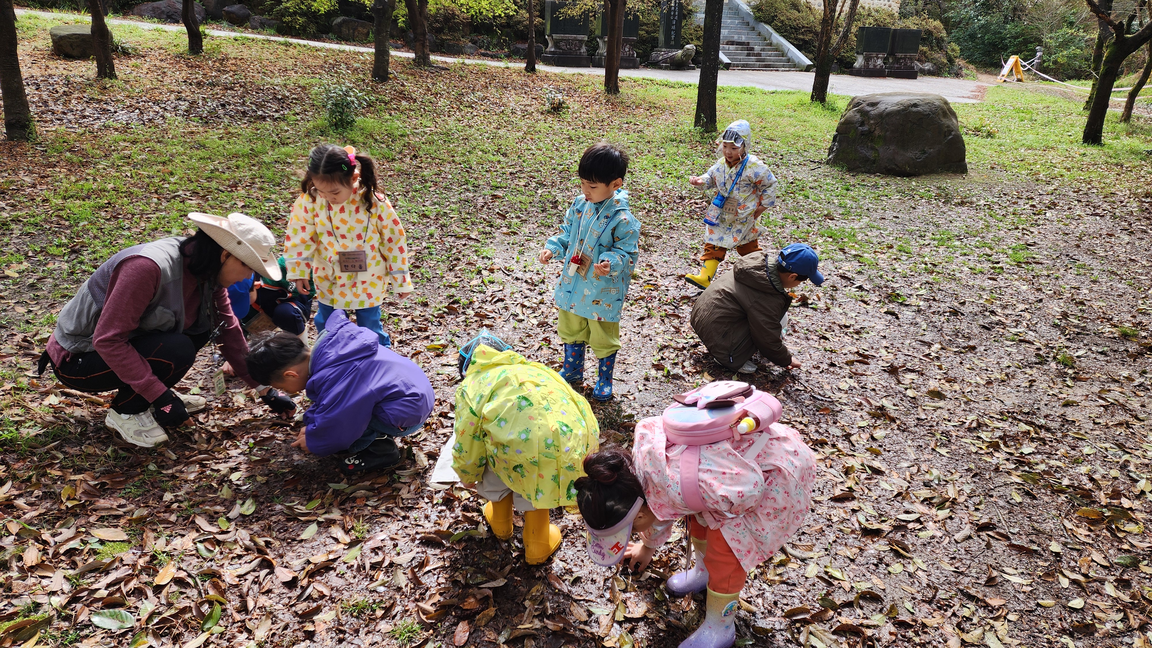 단풍잎에 매달린 빗방울을 보며 "선생님, 메이플 시럽같아요!"라고 외치는 친구들. 단풍잎을 살짝 흔들어 톡톡 떨어뜨린 빗방울을 맞으며, 우리 친구들은 진짜 메이플 시럽을 맞은 것처럼 달콤하다며 까르르 웃음을 터뜨렸지요. 친구들의 상상력이 숲을 더 달콤하게 만들어준 순간이었지요. 돋보기를 들고 나무를 관찰하며 동백나무 겨울눈이 꼭 애벌레 같다며 신기해 하고, 예쁜 광대나물의 꽃은 물고기 꼬리를 닮았다며 조잘거리는 친구들의 관찰력은 정말 대단했어요.