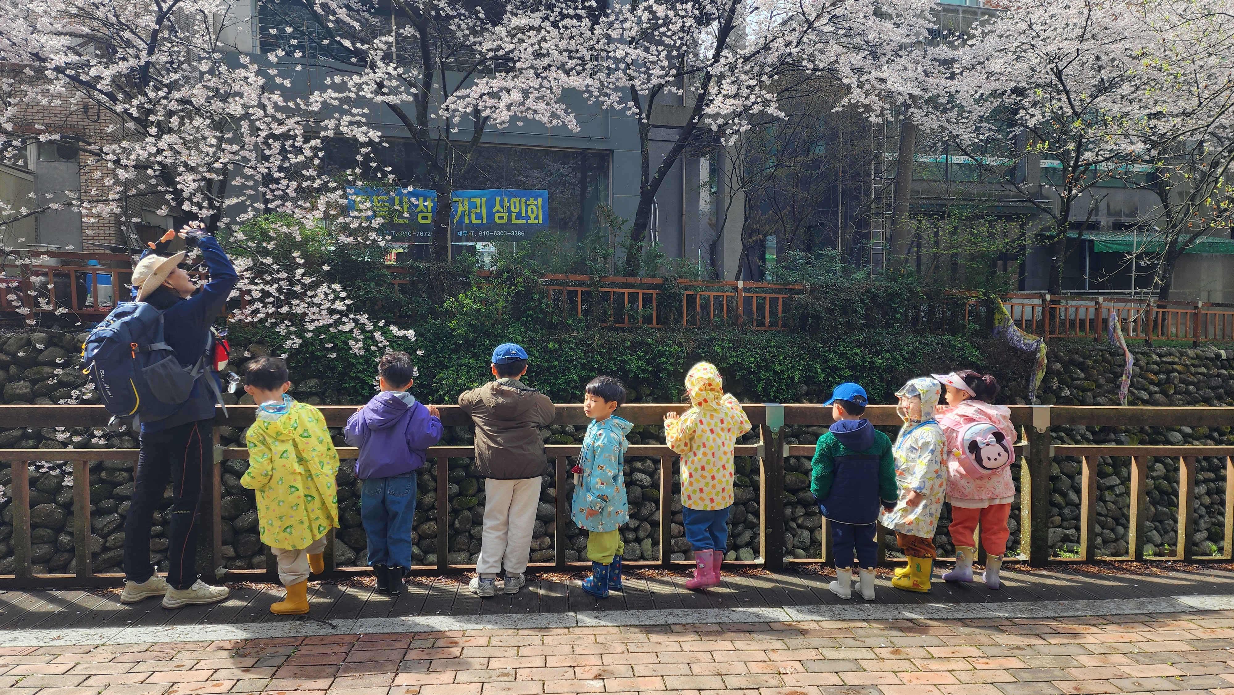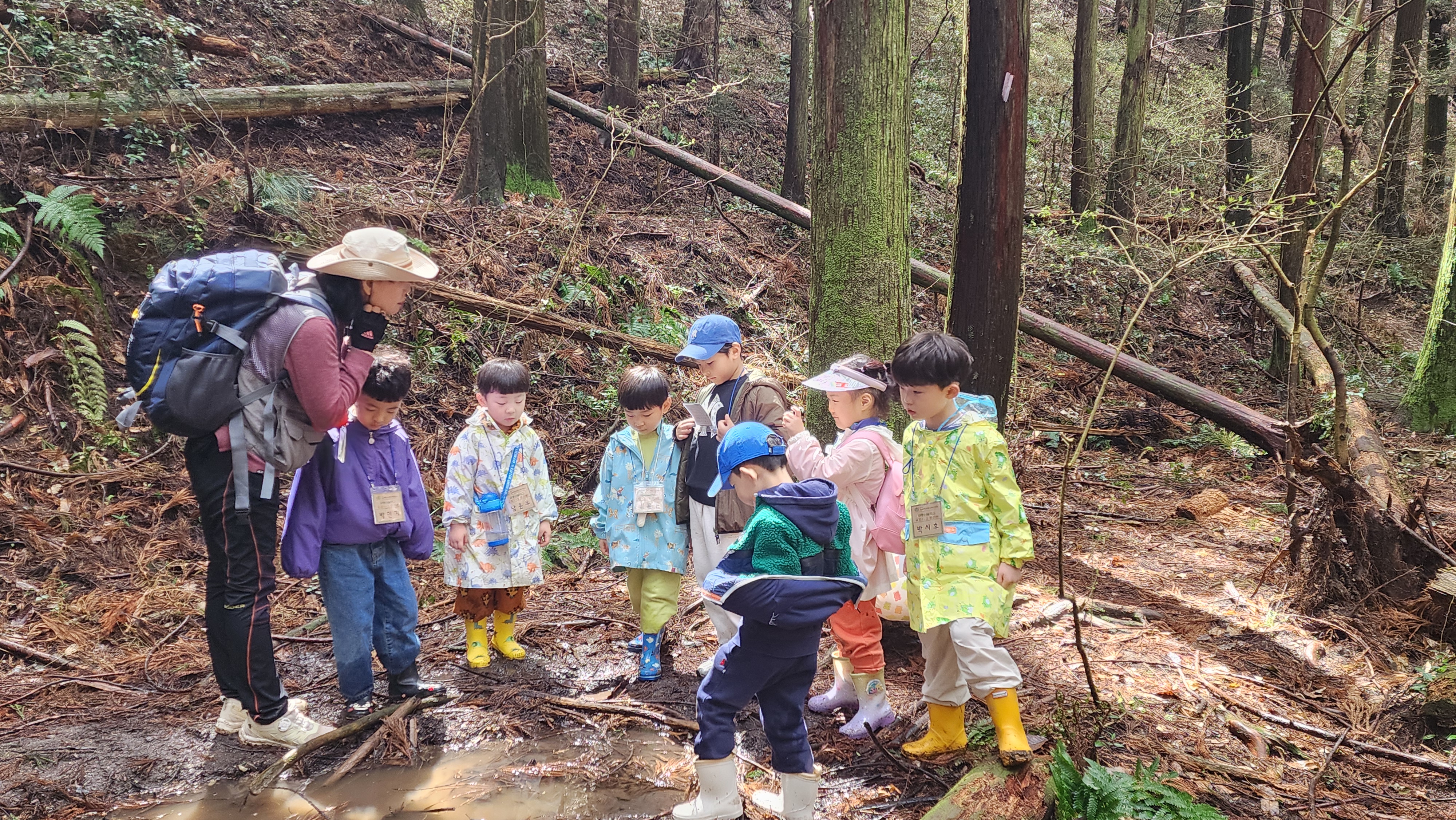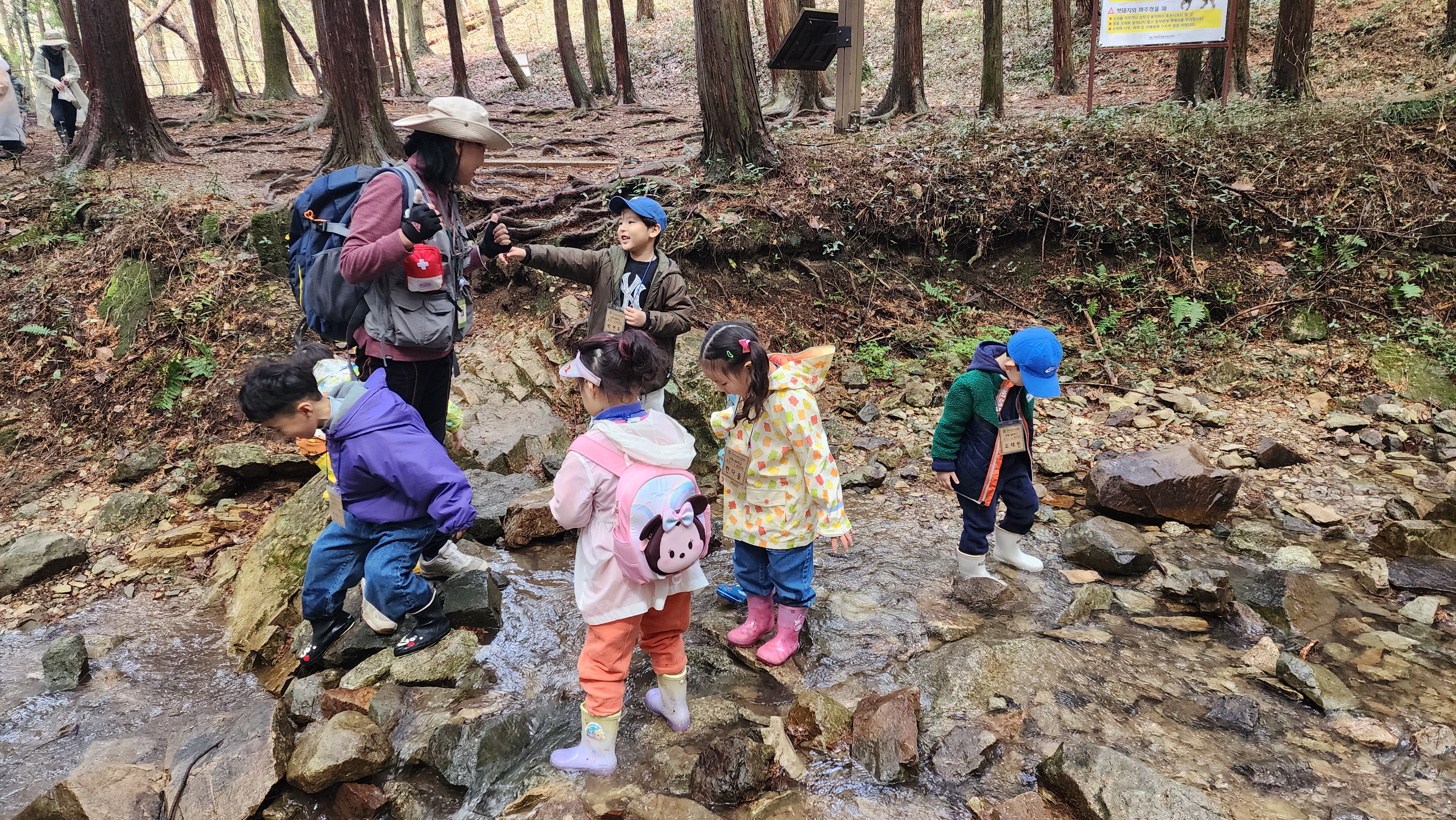 편백숲 계단을 한 발로 껑충껑충 뛰어오를 수 있다며 씩씩하게 앞장서던 친구들의 기분 좋은 목소리가 아직도 들리는 듯 해요. 봄비에 기분 좋게 불어난 계곡을 지나 동글동글 모여 있는 도롱뇽 알들이 우리를 기다리고 있었지요. 친구들은 곧 깨어날 올챙이들을 상상하며 꼬물꼬물 흉내도 내보고, 뭉쳐진 도롱뇽 알들을 보고 "선생님, 이건 꼭 문어 같아요!"라고 이야기했죠.