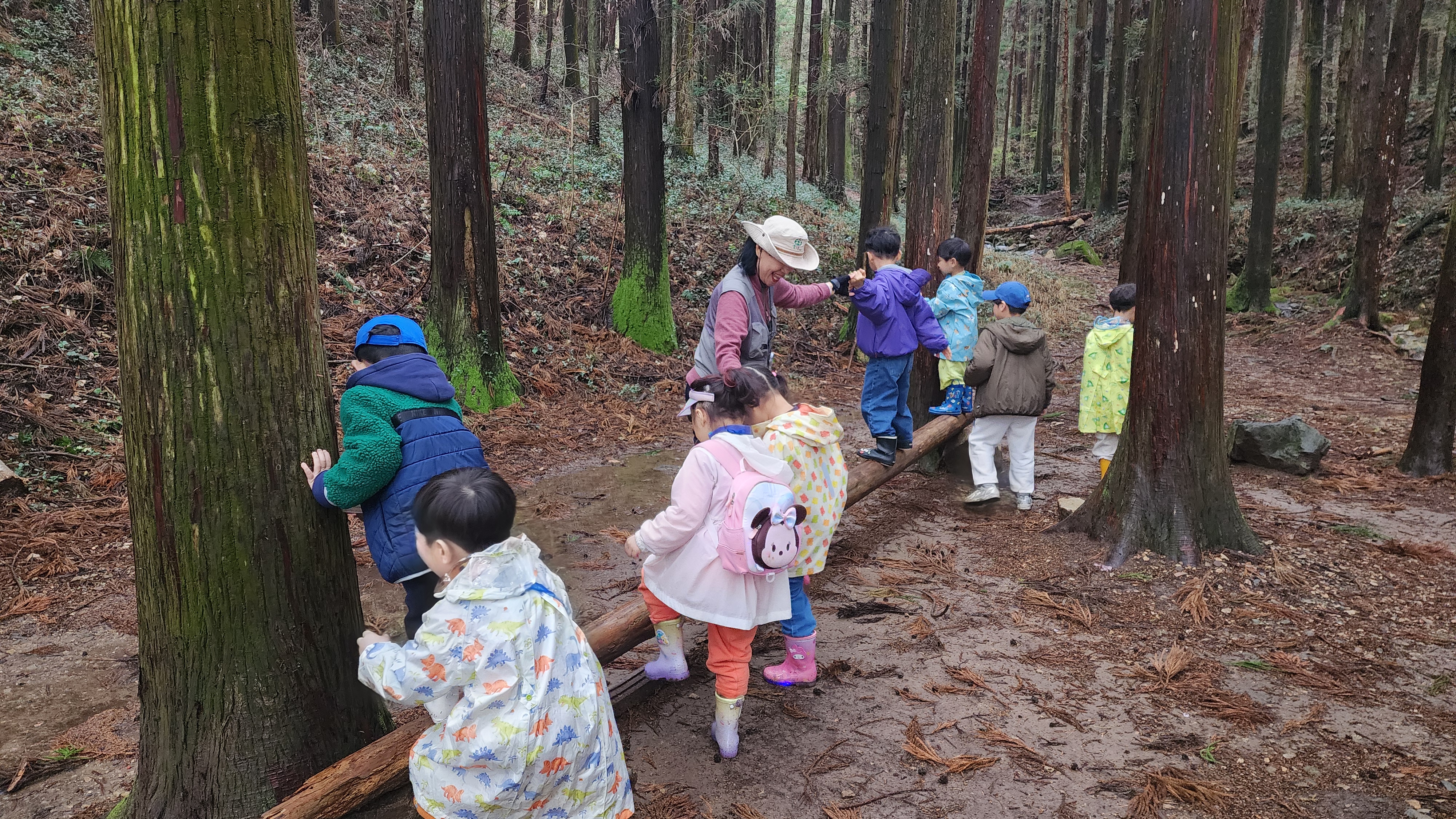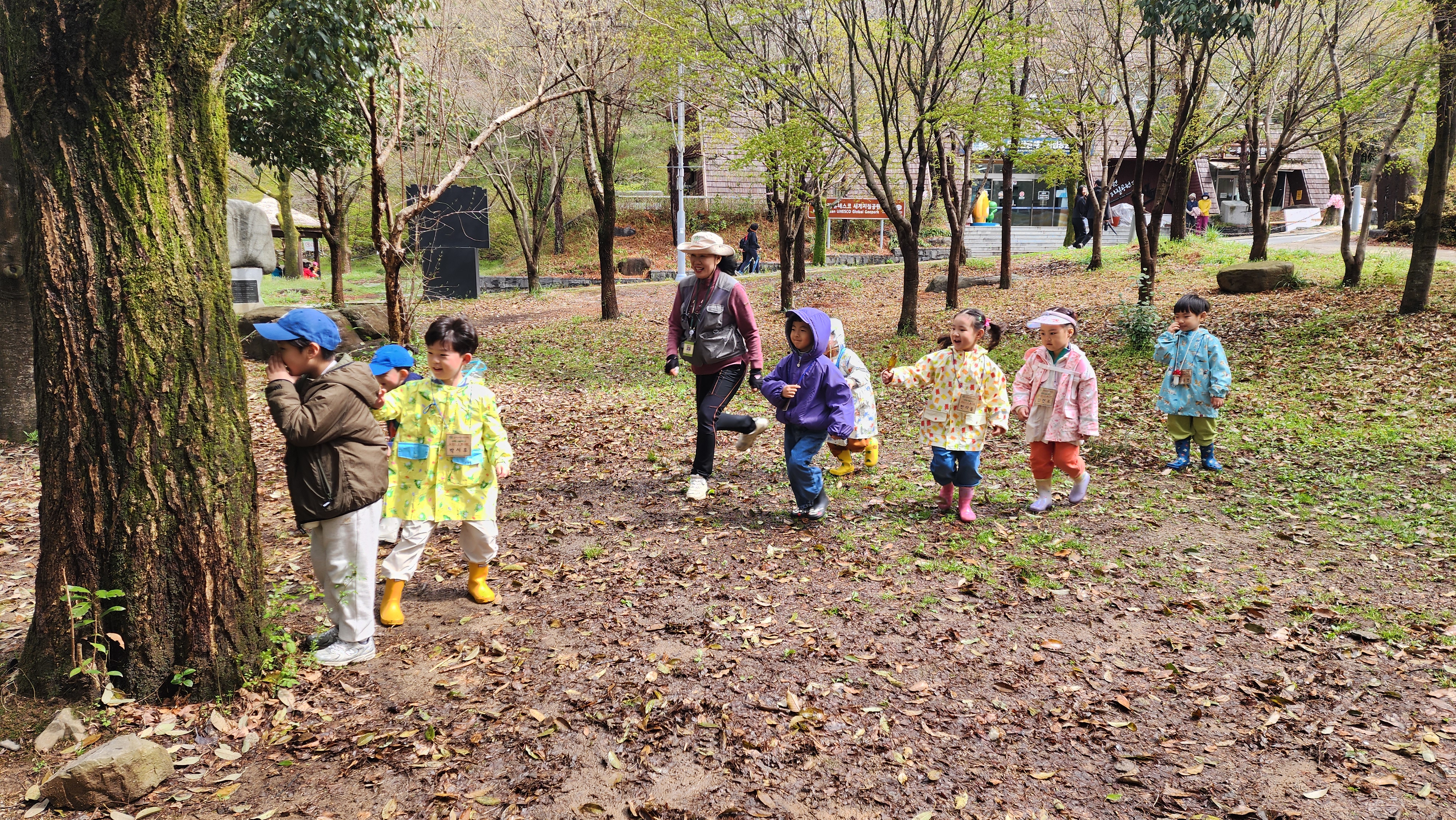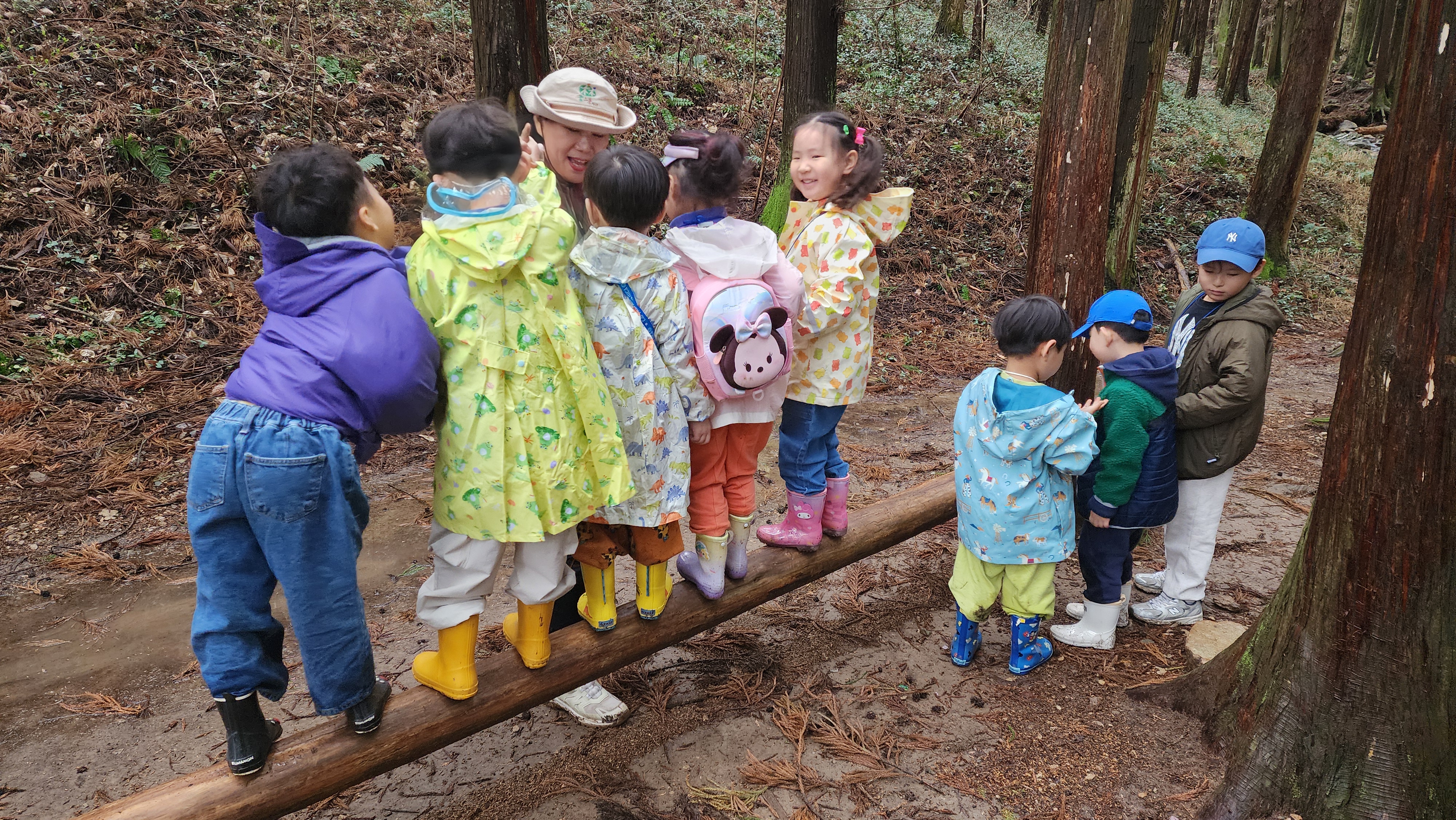숲에 높인 커다란 통나무 위를 걸으며 놀 때는 비에 젖어 조금 미끄러웠지만, 서로 조심조심 발을 내디디는 모습이 기특했어요. 비가 내려 더욱 싱그러웠던 무등산의 봄날, 자연과 진정한 친구가 된 우리 친구들과의 행복한 시간이었어요. 다음 달에도 더 즐거운 모습으로 다시 만나기로 꼭꼭 약속했지요.