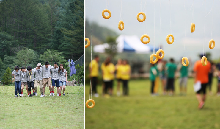 잔디마당과 족구전용 운동장에서 레크레이션 시간