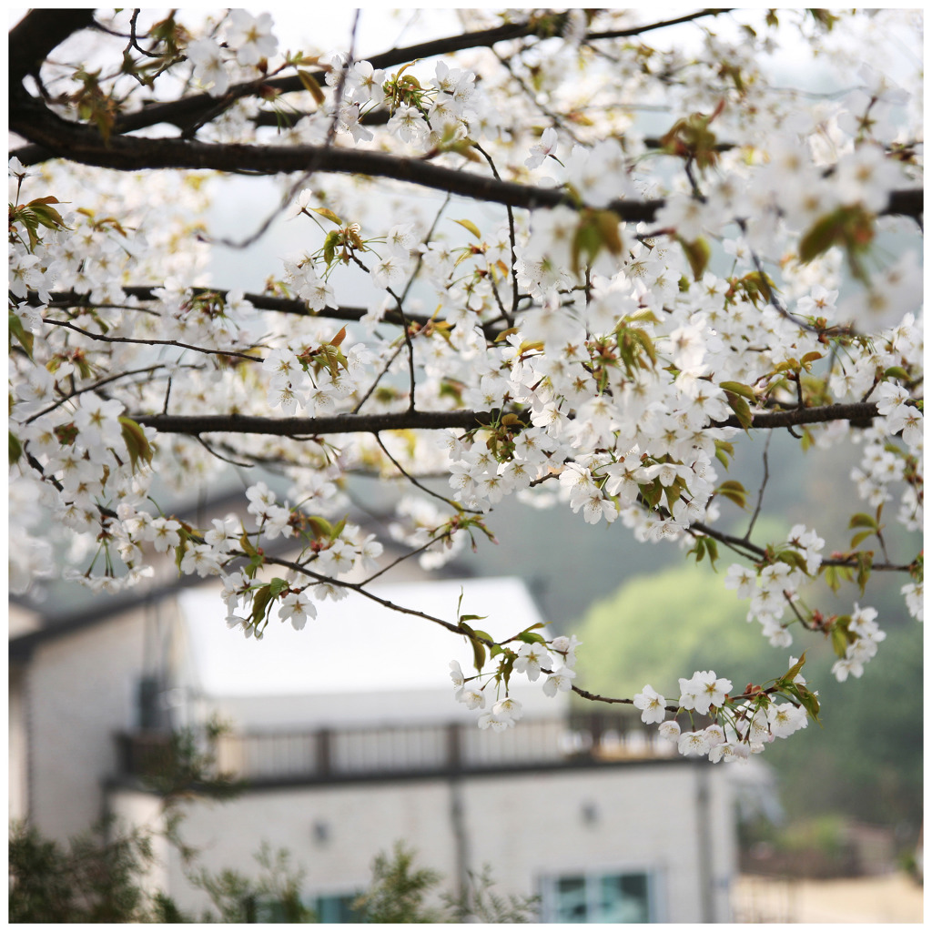 펜션 입구와 들어오는 입구 가로수길 하얀 벚꽃 눈발이 휘날리듯