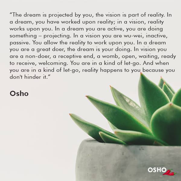 꿈은 그대가 투사해서 만들어낸 것이지만, 비전은 현실의 일부분이다. 그대는 꿈 속에서 현실을 꾸며내지만, 비전 속에서는 현실이 그대를 만들어간다. 그대는 꿈 속에서 뭔가를 계속 투사하며 적극적으로 존재한다. 하지만 비전 속에서는 비활동적이고 수동적이며 무위의 상태로 존재한다. 그대는 현실이 그대에게 영향을 미치도록 허용한다. 꿈 속에서 그대는 대단한 행위자이며, 그 꿈이 바로 그대의 행위이다. 비전 속에서 그대는 수용적으로 열려 있으며 모든 것을 기다리고 받아들일 준비가 된 무위자이다. 그대는 이른바 모든 것을 내려놓은 상태이다. 그리고 그대가 내려놓은 상태로 존재할 때, 현실이 그대에게 일어난다. 그대가 그것을 가로막지 않기 때문이다.