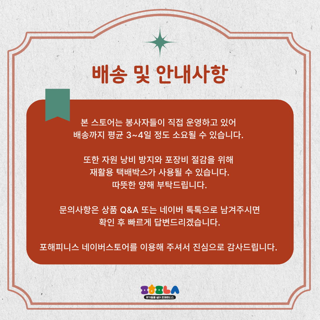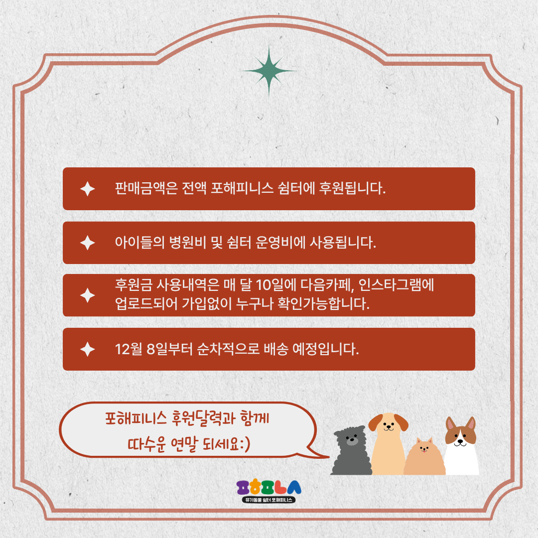 * 배송 방법: 택배 발송 또는 쉼터 방문 수령 중 선택 가능합니다.