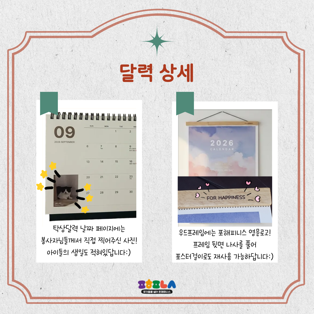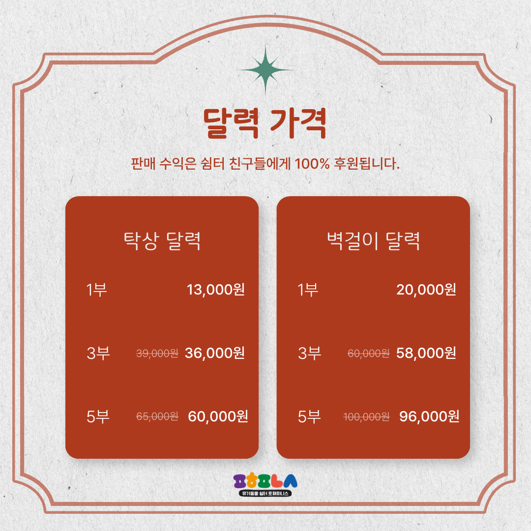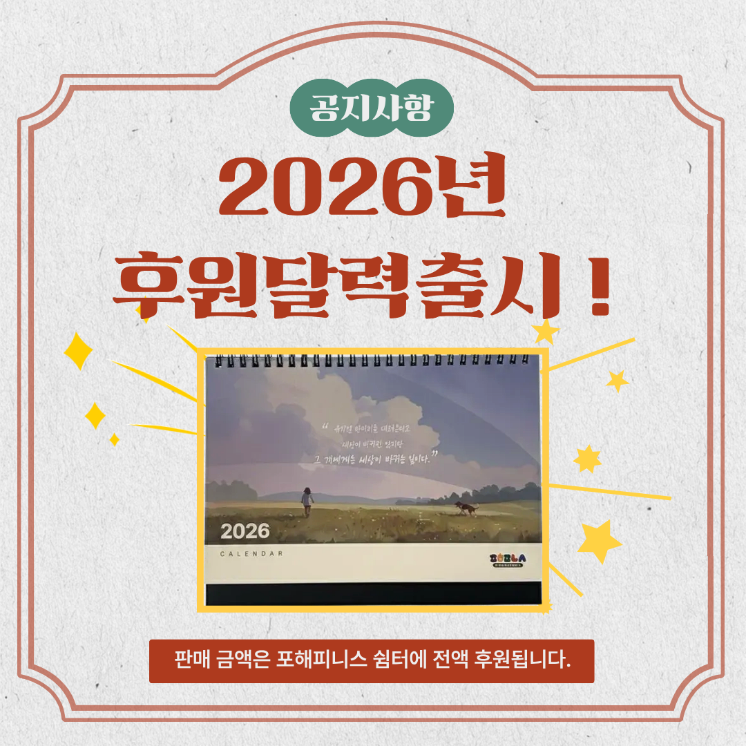 작성자설이 작성시간 25.11.29 달력 사진 제공해주신 분들, 현재 임시보호자님, 정회원(사단법인)에 도움을 주신 50인에게는 탁상달력 1부를 감사선물로 드릴 예정입니다. 구매에 참고부탁드립니다. 감사합니다!