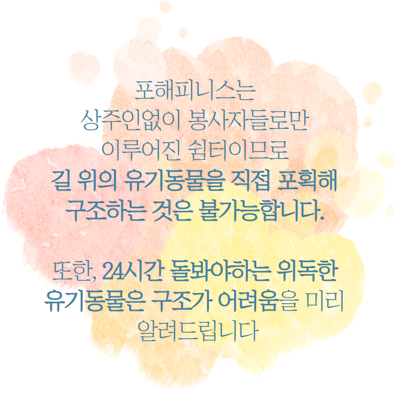 또한, 24시간 돌봐야하는 위독한 유기동물은 구조가 어려움을 미리 알려드립니다.