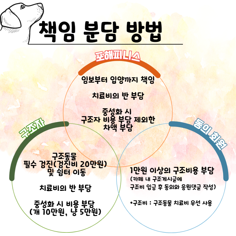 구조자 총 분담금 = 필수 검진 및 접종(정액 20만원) + (α) 중성화 필요시(개: 10만원, 고양이: 5만원) + (β) 치료 필요시 치료비의 절반