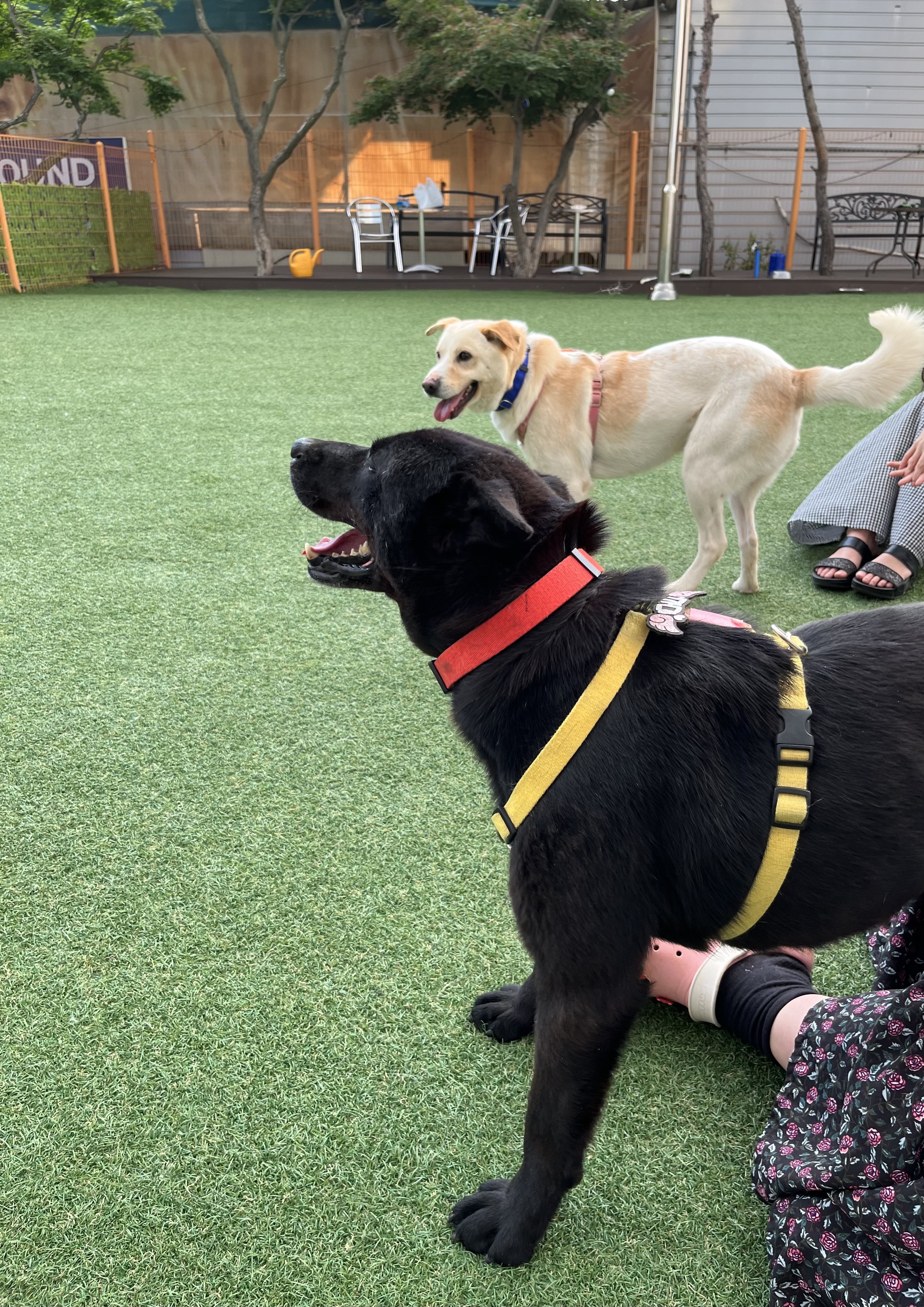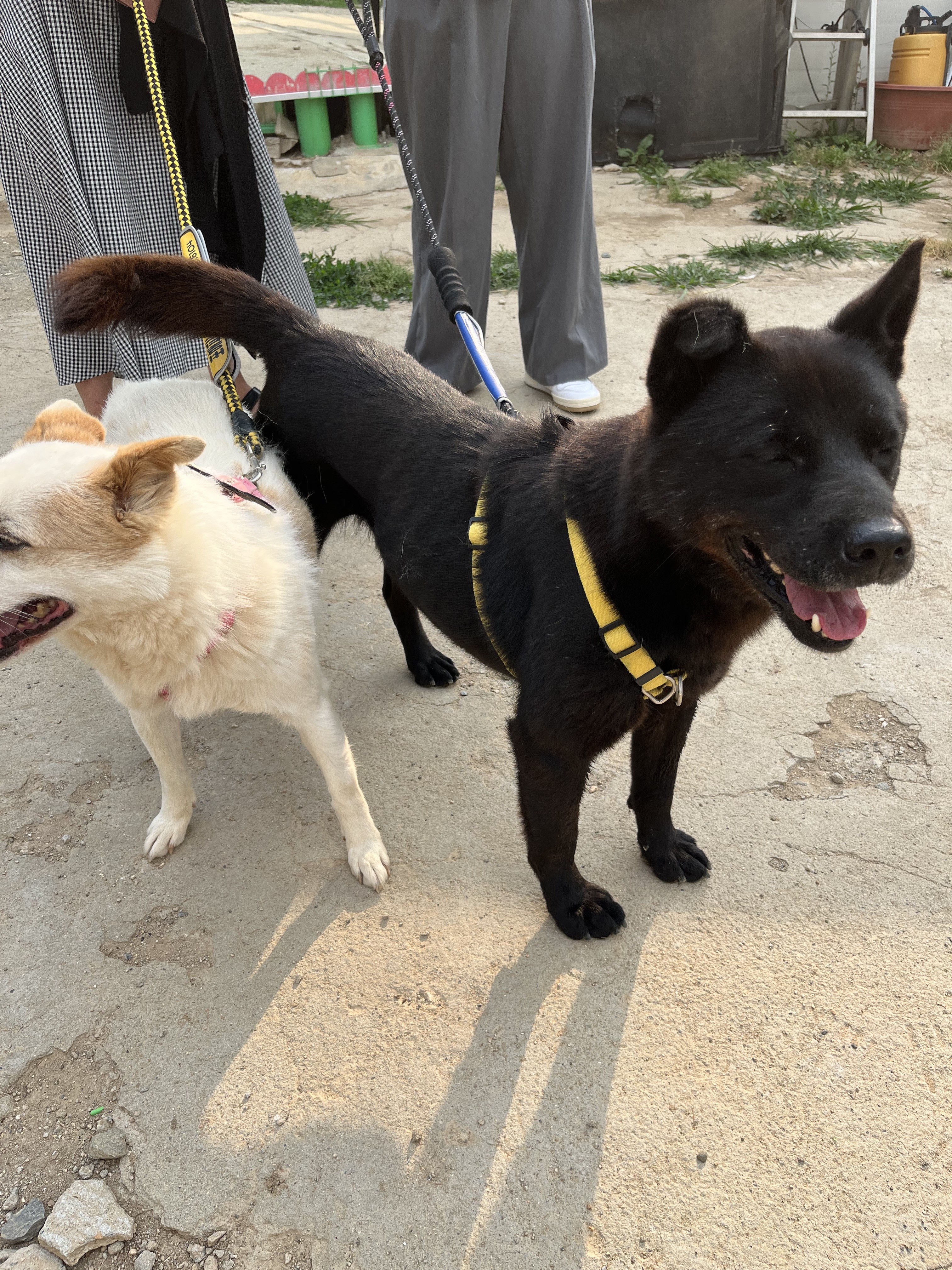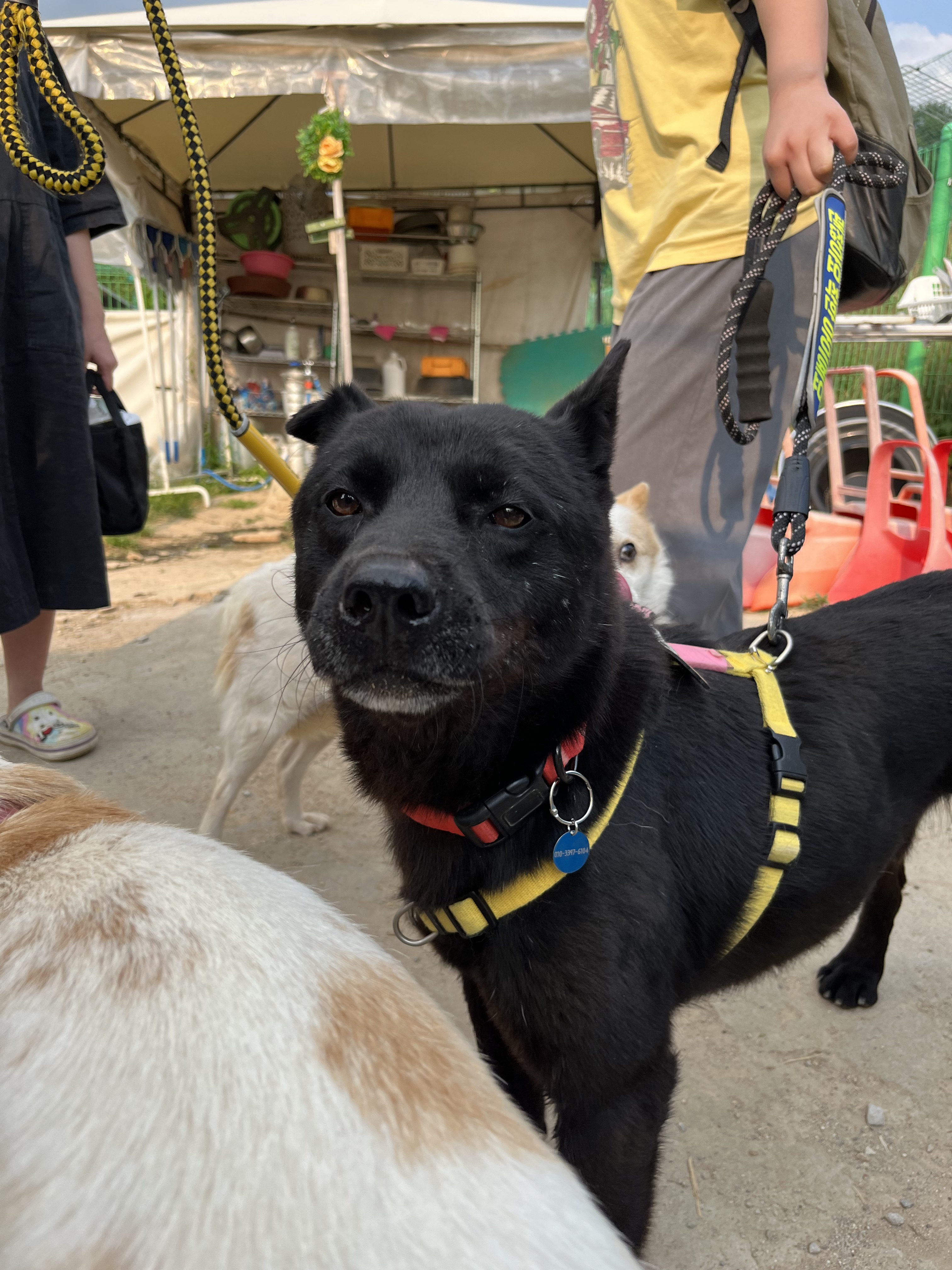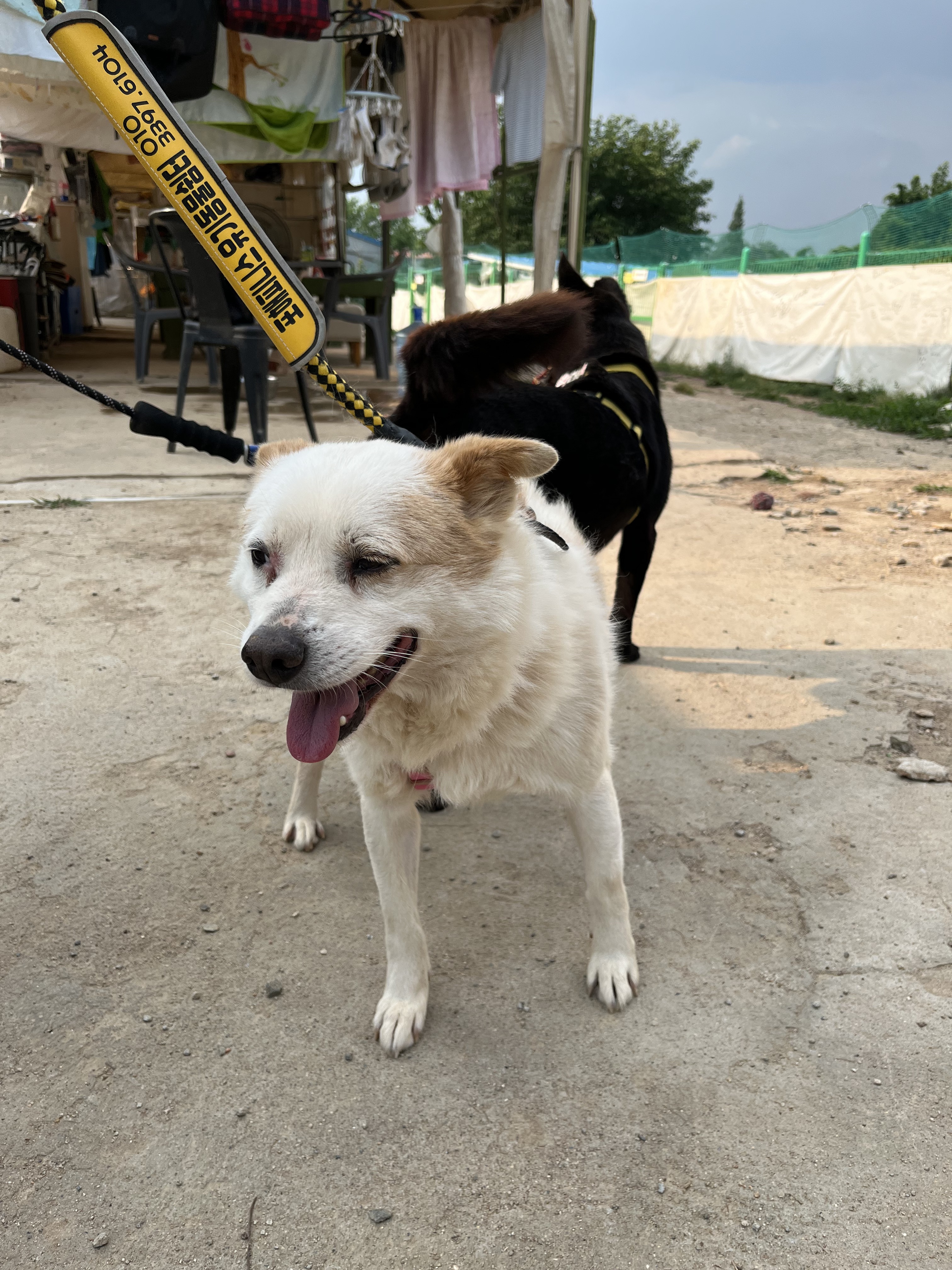•루디 : 은근 낯을 가리는 것 같아요. 긴장 했는지 설사도 하구요 ㅠㅠ 예전에 루디 목욕 후 동네 공원에 갔을때는 이런 느낌을 전혀 못받았어서 ( 그때는 막 뛰어다녔는데 ) 좀 의아했어요. 😂 다른 강아지들이랑 잘 놀아요. 시간이 흐른 뒤에는 적응을 했는지 보호소에서 하던것처럼 까미와 놀려고 해요~ 여기서도 새로운 사람에게 한번씩은 다가가는 친화력 ㅎㅎ