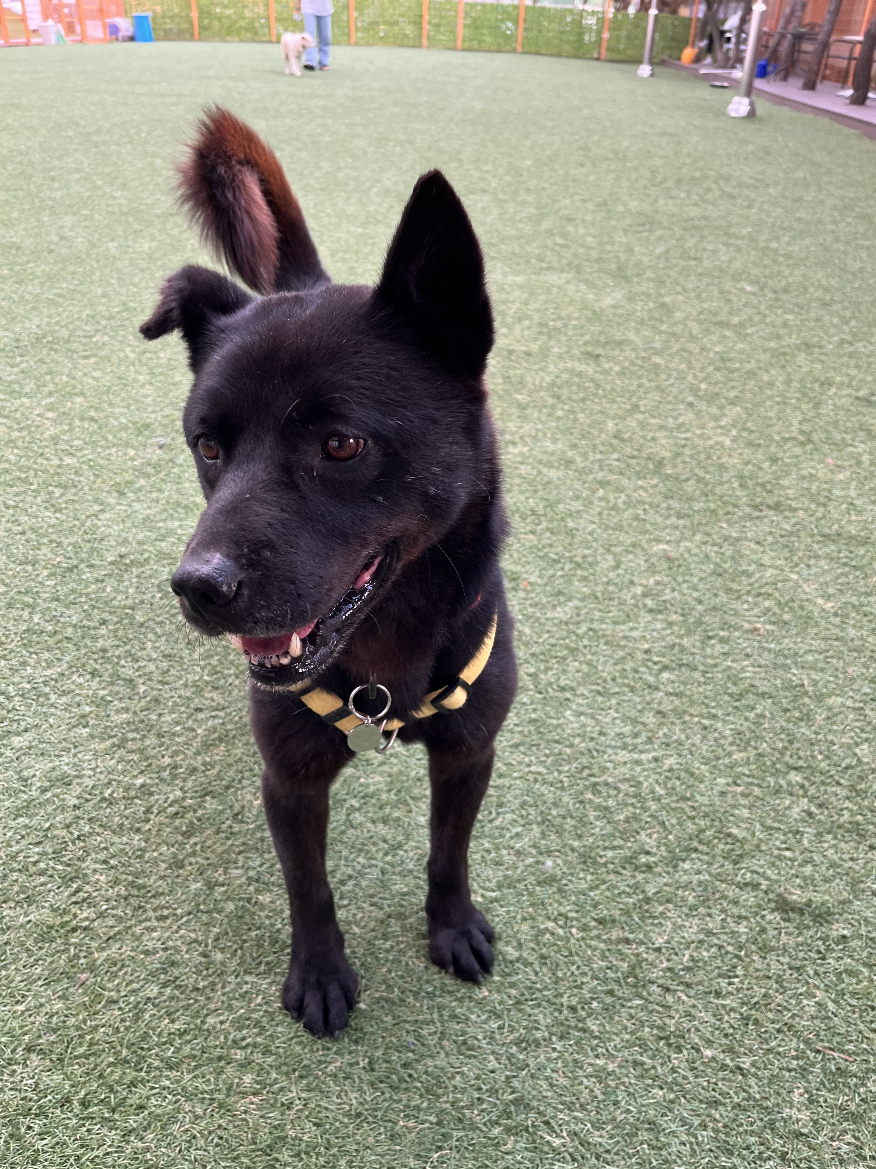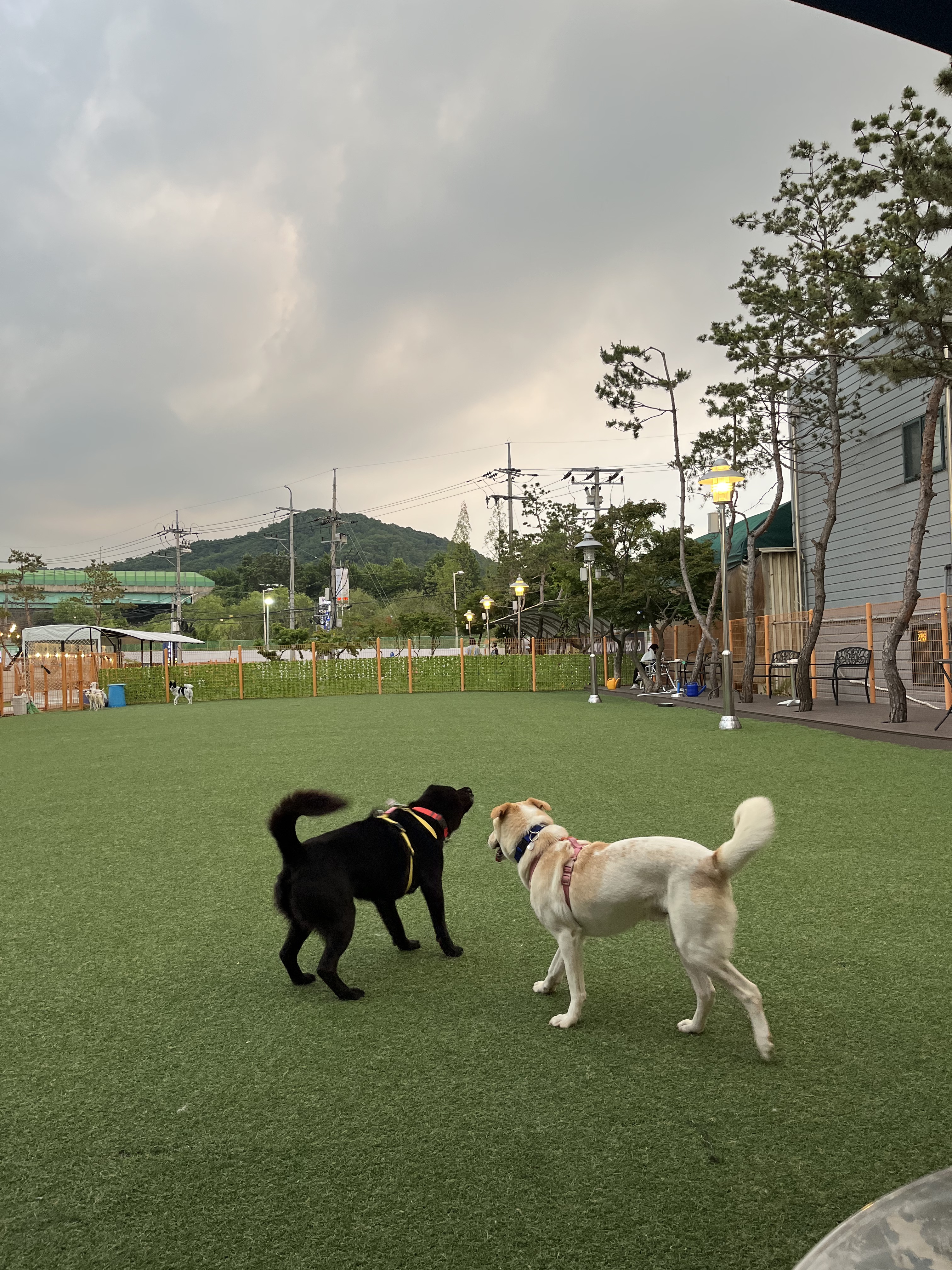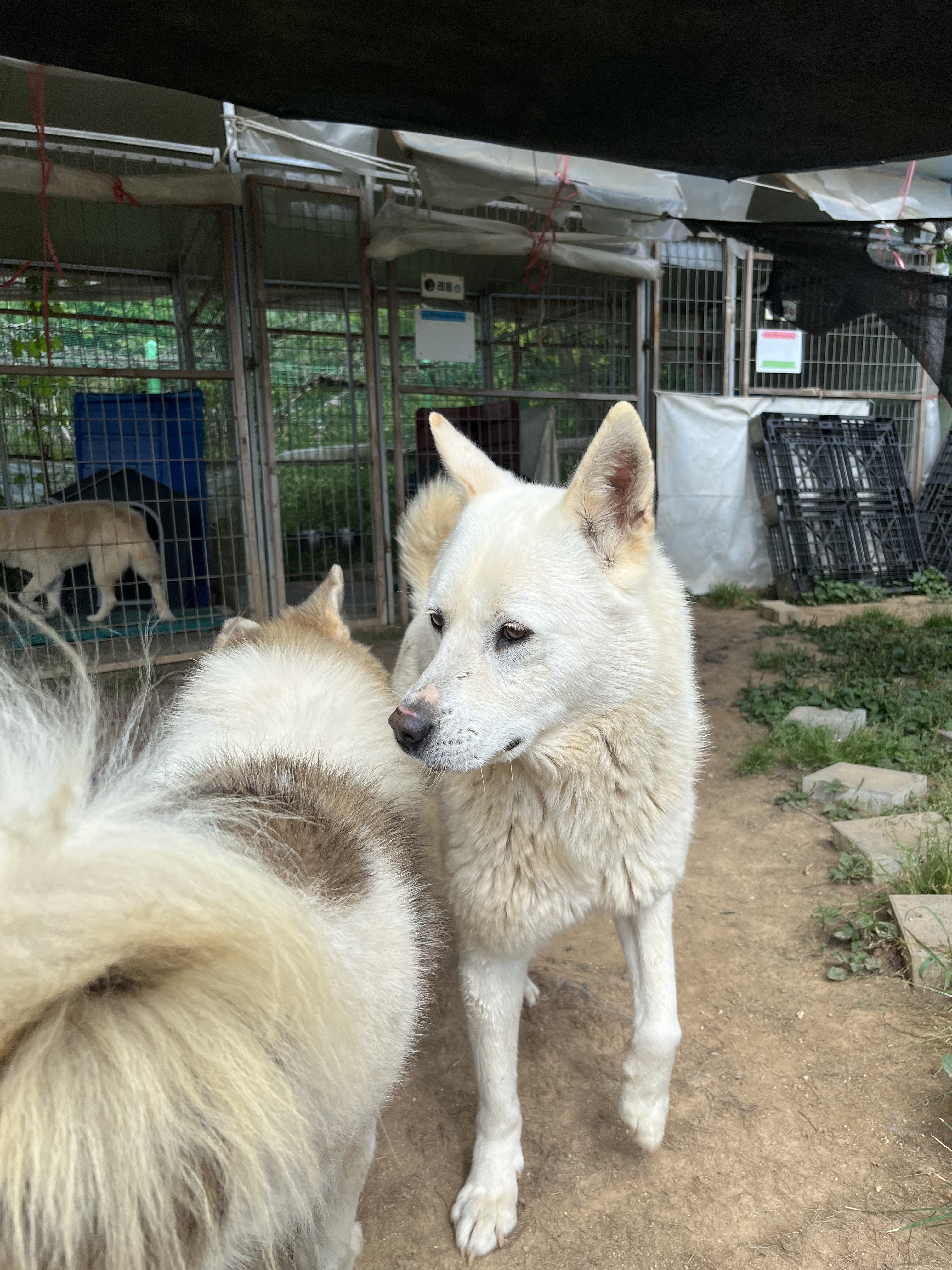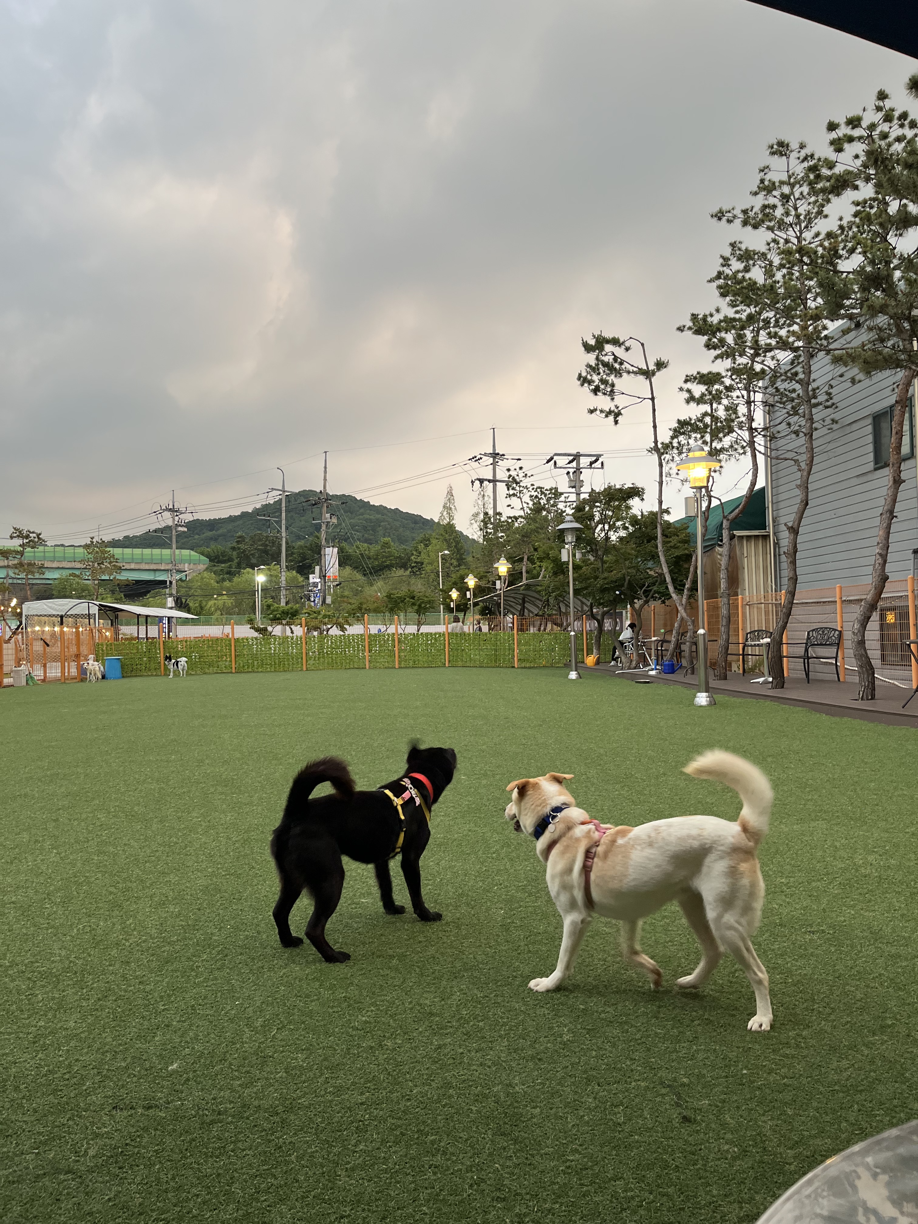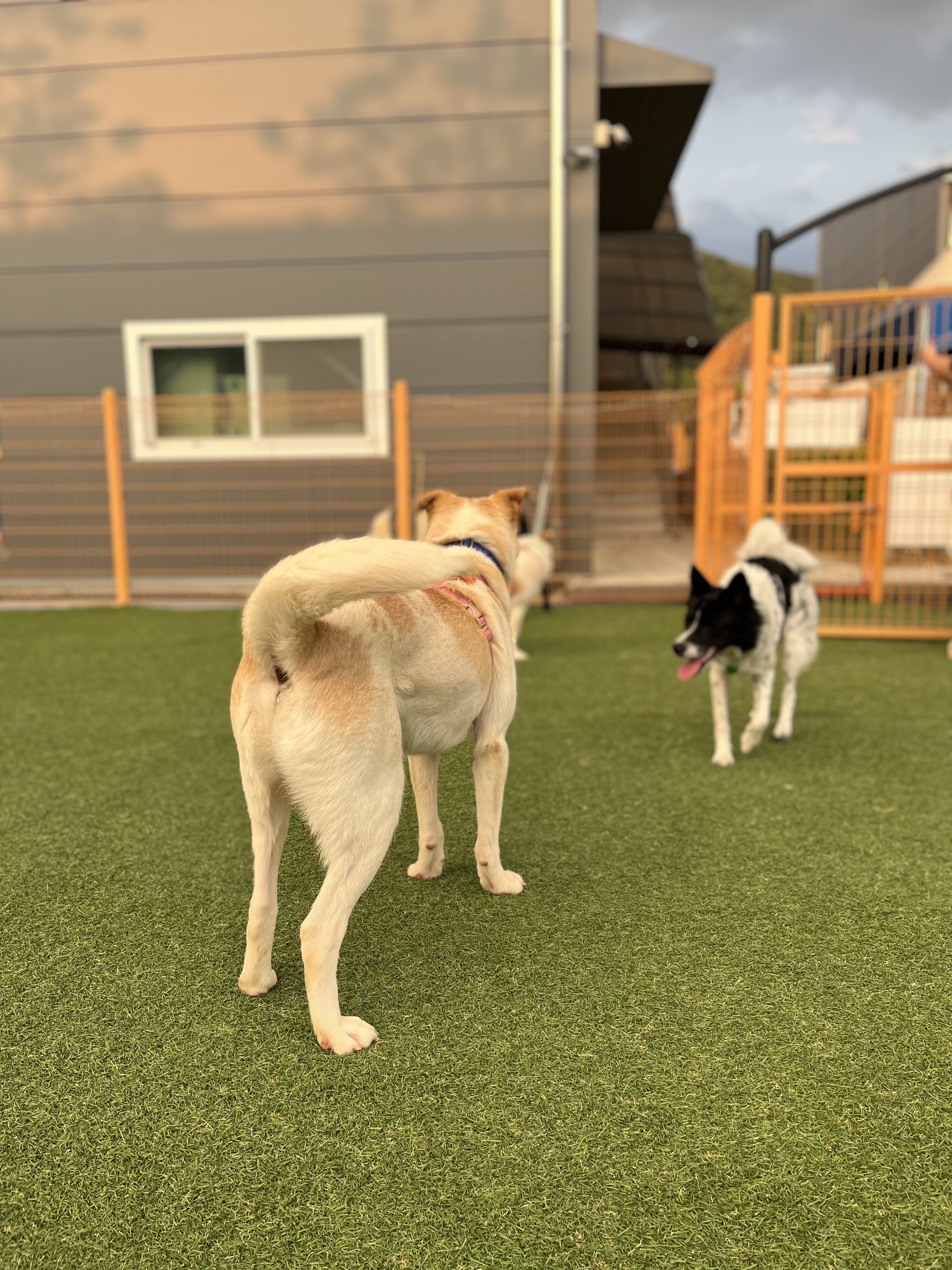 •루디 : 은근 낯을 가리는 것 같아요. 긴장 했는지 설사도 하구요 ㅠㅠ 예전에 루디 목욕 후 동네 공원에 갔을때는 이런 느낌을 전혀 못받았어서 ( 그때는 막 뛰어다녔는데 ) 좀 의아했어요. 😂 다른 강아지들이랑 잘 놀아요. 시간이 흐른 뒤에는 적응을 했는지 보호소에서 하던것처럼 까미와 놀려고 해요~ 여기서도 새로운 사람에게 한번씩은 다가가는 친화력 ㅎㅎ