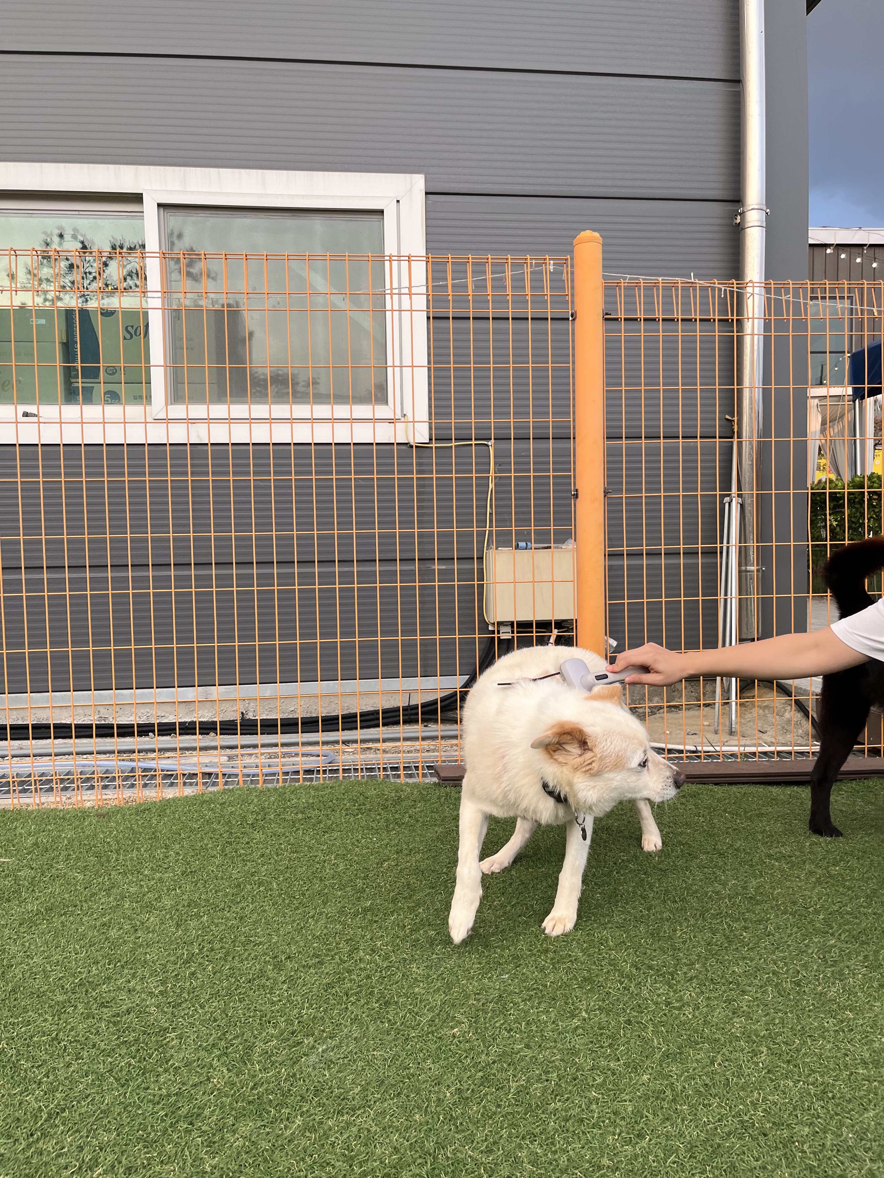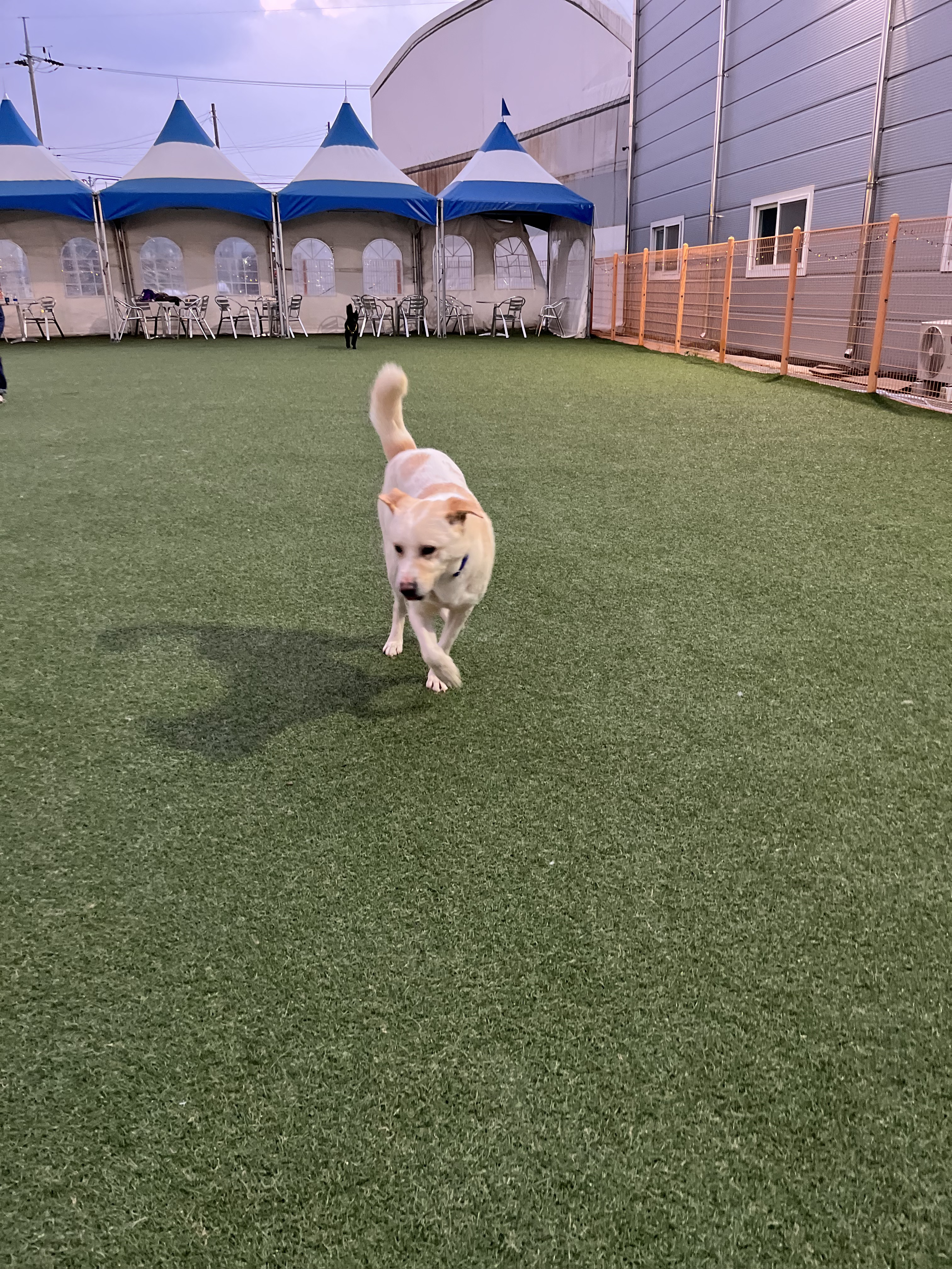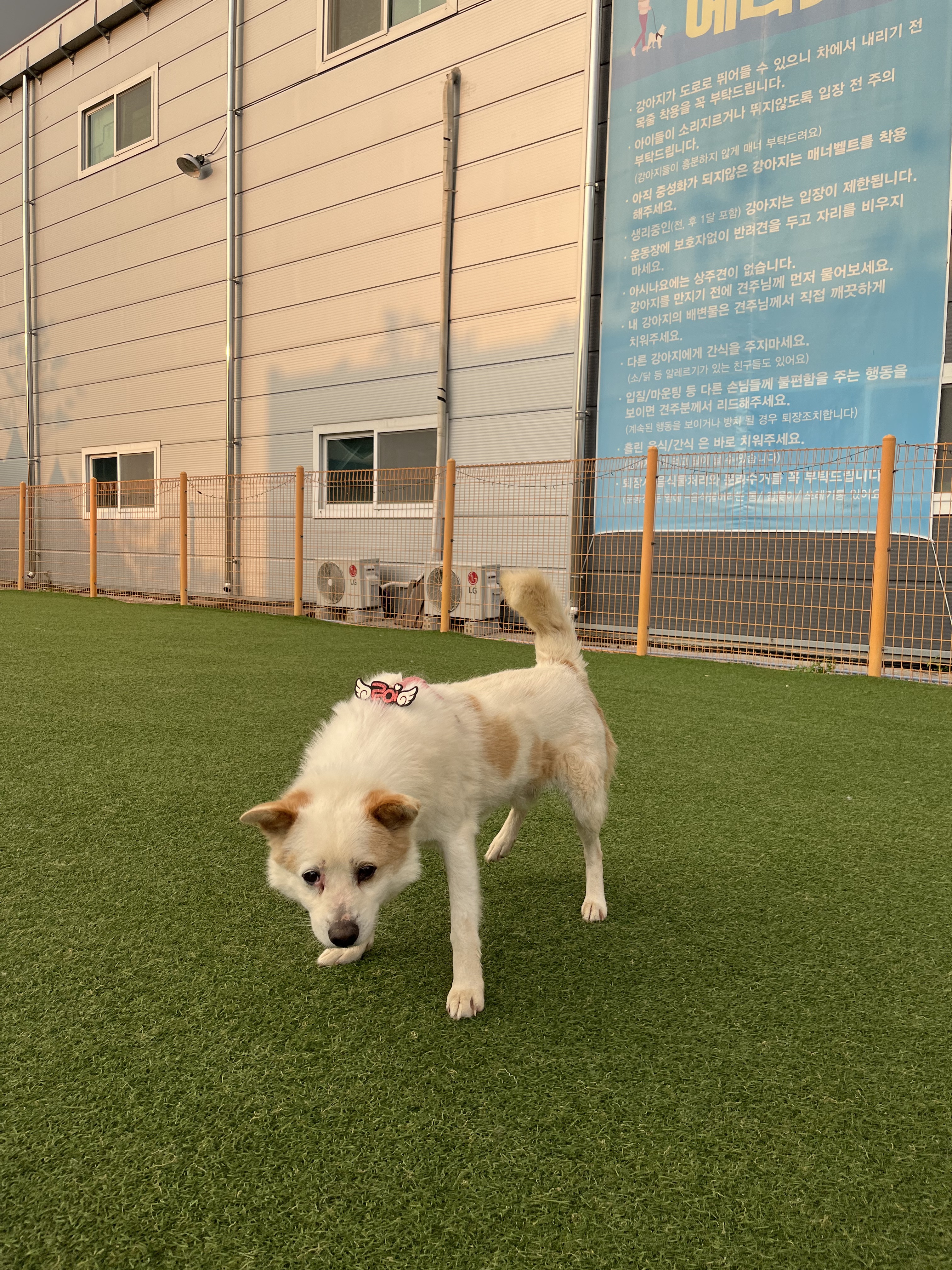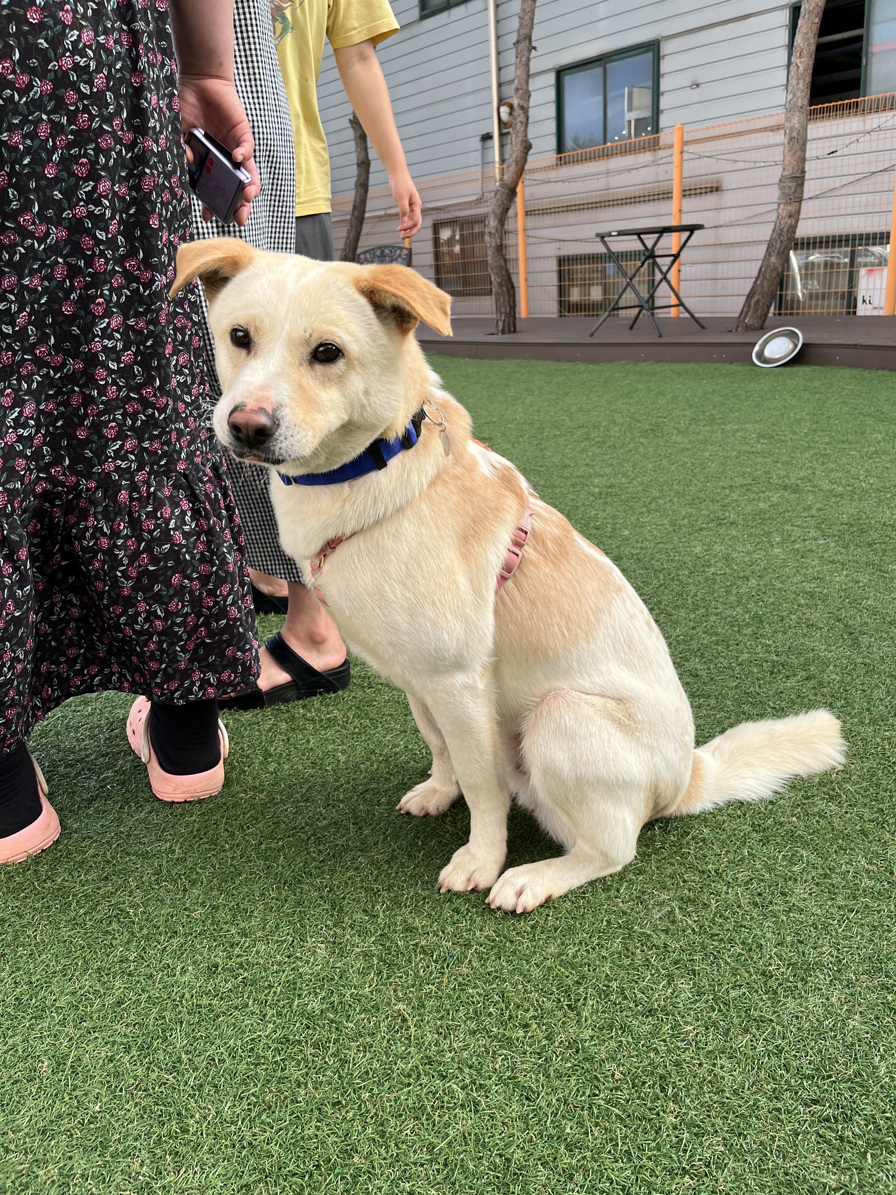 •루이 : 낯선 장소에서 사람에게 의지하지는 않아요. 운동장에 가서도 여전히 저희가 쫓아가면 피했어요. 그래도 잡아다가 빗질하거나 만지면 참아주기는 해요. 다른 강아지들 오면 너무 너무 좋아하면서 꼬리 흔들며 다가갔어요 ! 뛰어놀았으면 좋겠어서 제가 막 쫓아가니까 도망가다가 넘 무서운지 주저앉아버렸어요 ㅠㅠ ( 미안하다 😭)