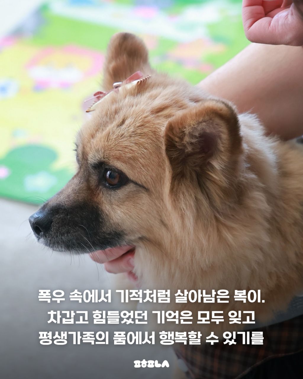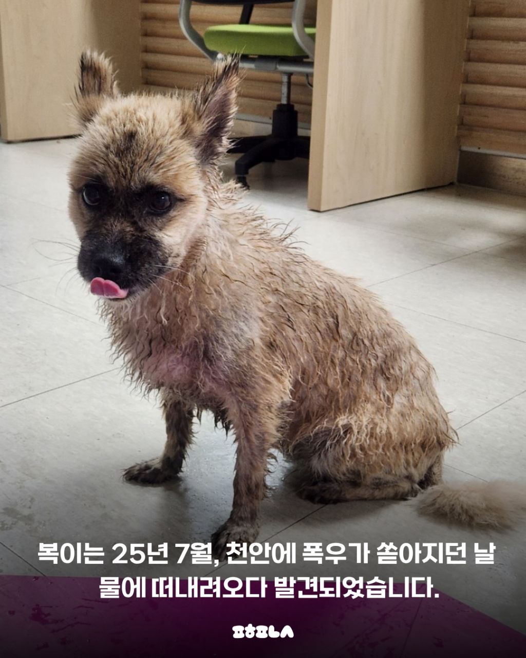 작년 7월, 폭우에 떠내려오던 중 기적적으로 구조된 복이. 복이는 현재 임보처에서 따뜻한 보살핌을 받으며 가족을 기다리고 있어요.