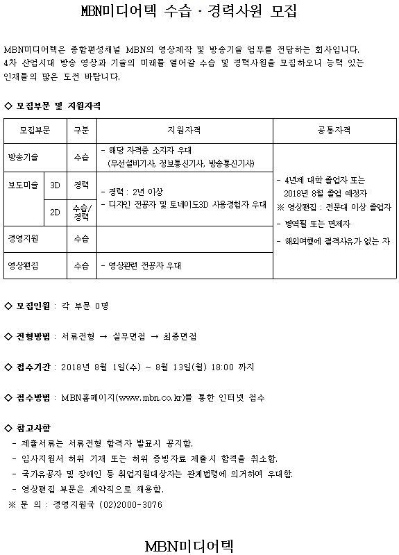 [[채용]]MBN미디어텍 방송기술, 보도미술, 경영지원, 영상편집 수습 및 경력사원 채용 작성자상도덩|작성시간18.08.06|조회수1,306 목록 댓글 0 글자크기 작게가 글자크기 크게가 https://recruit.mbn.co.kr/pages/recruit_view.php?recruit_seq_no=115&page=1 다음검색 현재 게시글 추가 기능 열기 북마크 공유하기 신고 센터로 신고 댓글 댓글 0 댓글쓰기 답글쓰기 댓글 리스트