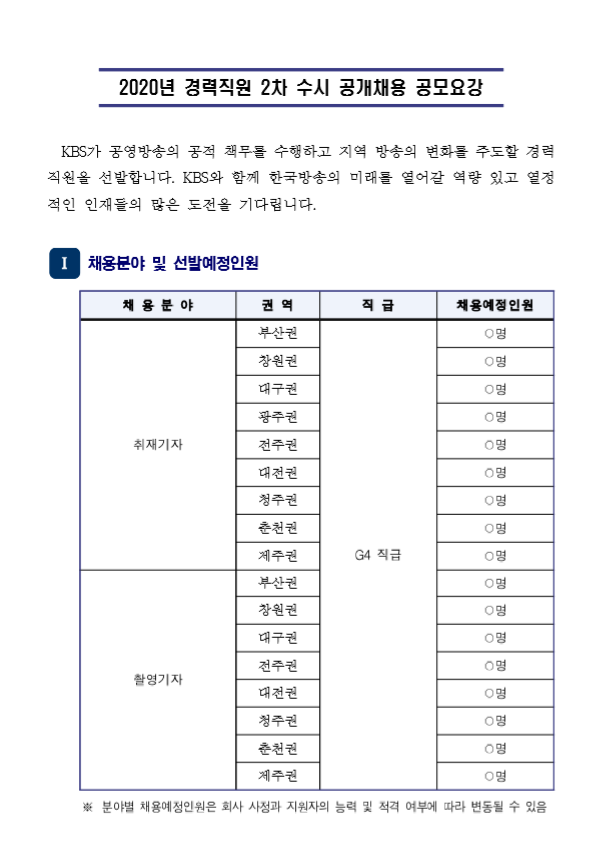 2020년 경력직원 2차(취재/촬영기자) 수시 공개채용 (~1월 20일) 작성자qoiewfallkj|작성시간20.01.15|조회수5,745 목록 댓글 0 글자크기 작게가 글자크기 크게가 2020년 경력직원 2차 수시 공개채용 공모요강.pdf지워졌길래 다시 올립니다. KBS채용 홈페이지에서 퍼왔습니다. 첨부파일첨부된 파일이 2개 있습니다. etc 파일 1.PNG 다운로드 pdf 파일 2020년 경력직원 2차 수시 공개채용 공모요강.pdf 다운로드 다음검색 현재 게시글 추가 기능 열기 북마크 공유하기 신고 센터로 신고 댓글 댓글 0 댓글쓰기 답글쓰기 댓글 리스트