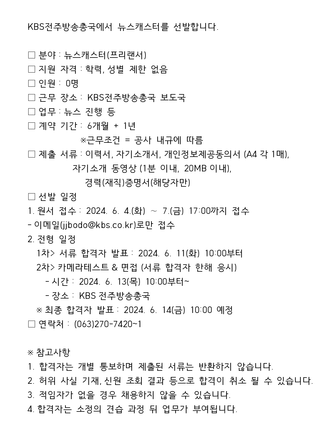 KBS전주총국에서 뉴스캐스터를 선발합니다. 작성자식샤를합시댜|작성시간24.06.05|조회수1,998 목록 댓글 0 글자크기 작게가 글자크기 크게가 다음검색 현재 게시글 추가 기능 열기 북마크 공유하기 신고 센터로 신고 댓글 댓글 0 댓글쓰기 답글쓰기 댓글 리스트