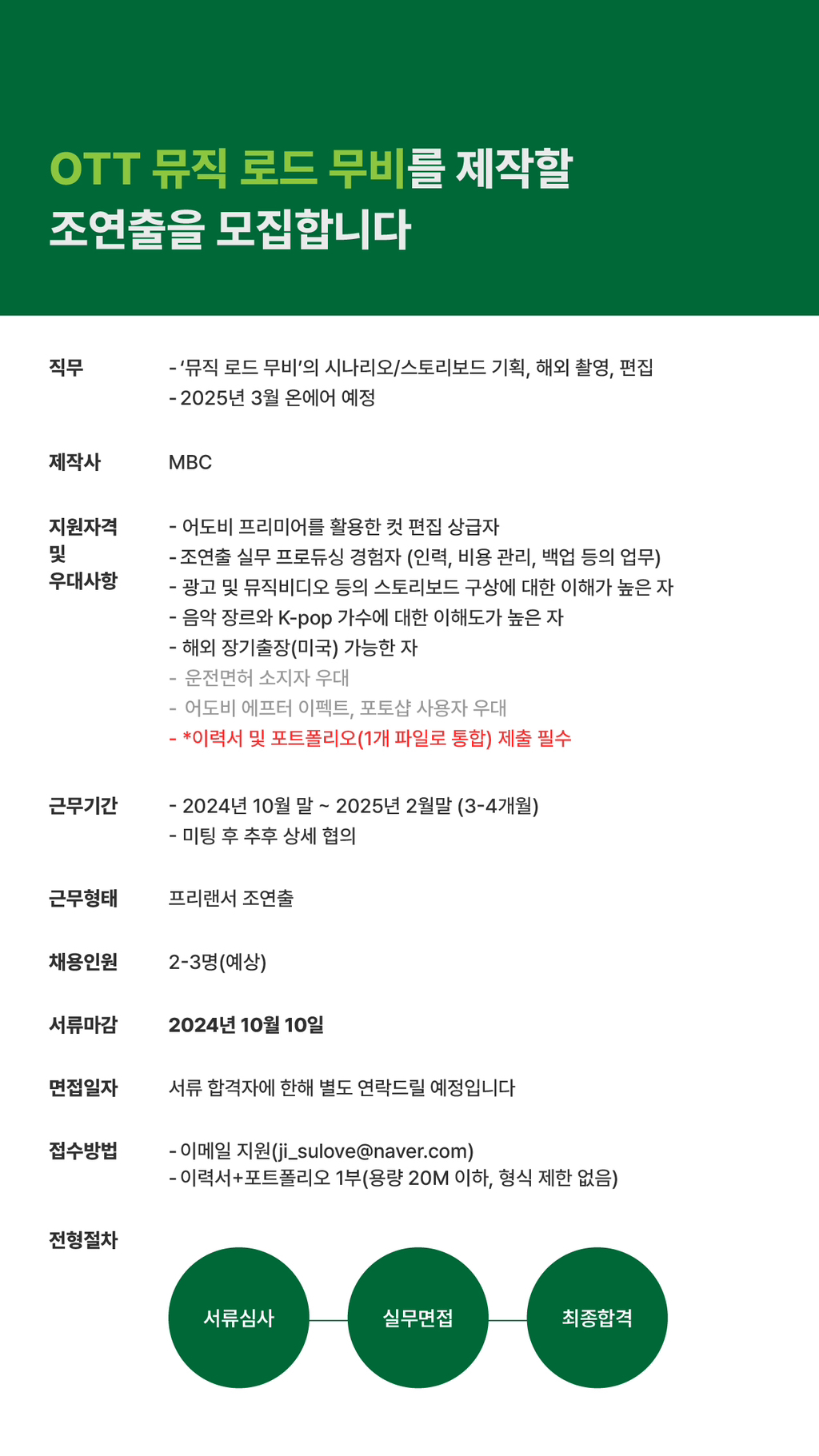 [MBC] OTT 프로그램 조연출 모집 (~10/10 마감) 작성자채용정보M|작성시간24.10.01|조회수5,701 목록 댓글 3 글자크기 작게가 글자크기 크게가 다음검색 현재 게시글 추가 기능 열기 북마크 공유하기 신고 센터로 신고 댓글 댓글 3 댓글쓰기 답글쓰기 댓글 리스트 작성자A_rang | 작성시간 24.10.04 이제 방송사가 플랫폼 기능이 아닌 외주 제작사 노릇을 하는 시대군요. 답댓글 작성자LOBYDUBY | 작성시간 24.10.05 기업 유튜브채널 대행도 할걸요....? 작성자후야 | 작성시간 24.10.16 혹시 서류 합격자 연락이 갔나요?? 댓글 전체보기