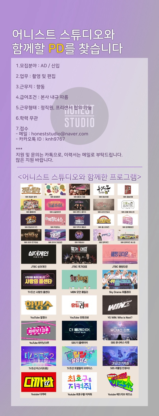 [어니스트 스튜디오]에서 신입 조연출을 모집합니다