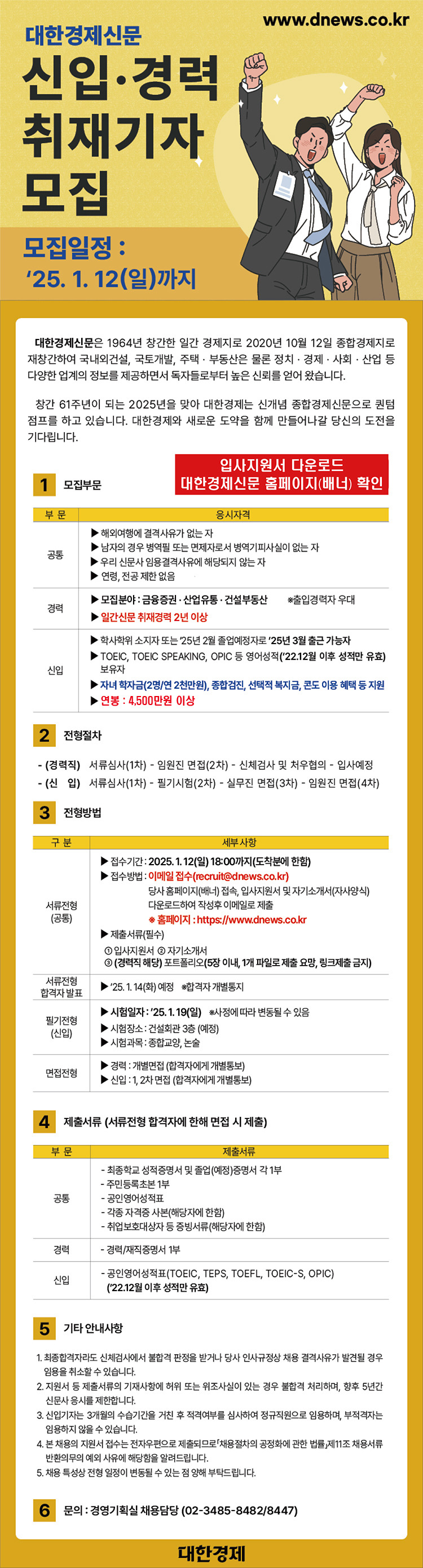 [[채용]]대한경제 신문사 신입 및 경력기자 채용 작성자누구세요...|작성시간24.12.27|조회수5,923 목록 댓글 2 글자크기 작게가 글자크기 크게가 대한경제 신문사에서 신입 및 경력기자를 채용합니다.(주)대한경제신문사 (경력) 입사지원서.hwp46.50KB(주)대한경제신문사 (신입) 입사지원서.hwp47.00KB 첨부파일첨부된 파일이 3개 있습니다. jpg 파일 대한경제 직원 모집 공고 수정.jpg 다운로드 hwp 파일 (주)대한경제신문사 (경력) 입사지원서.hwp 다운로드 hwp 파일 (주)대한경제신문사 (신입) 입사지원서.hwp 다운로드 다음검색 현재 게시글 추가 기능 열기 북마크 공유하기 신고 센터로 신고 댓글 댓글 2 댓글쓰기 답글쓰기 댓글 리스트 작성자다이슨 | 작성시간 25.01.09 꿀회사?그정돈가요? 답댓글 작성자🧞 | 작성시간 25.01.12 꿀빠는 회사라는 뜻이 아니라..2020년까지만 해도 농민신문과 같이 처우 좋고 망할일 없고 전문성 키우기 좋은 곳으로 꼽혔는데 어느샌가 두 곳 모두 언시생들이 언급을 안 하기 시작했어요 댓글 전체보기