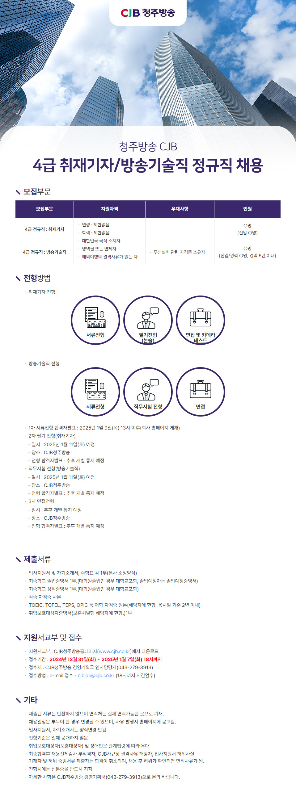[[채용]]CJB청주방송 신입기자 및 방송기술직 채용 작성자우스터|작성시간24.12.31|조회수2,877 목록 댓글 0 글자크기 작게가 글자크기 크게가 다음검색 현재 게시글 추가 기능 열기 북마크 공유하기 신고 센터로 신고 댓글 댓글 0 댓글쓰기 답글쓰기 댓글 리스트