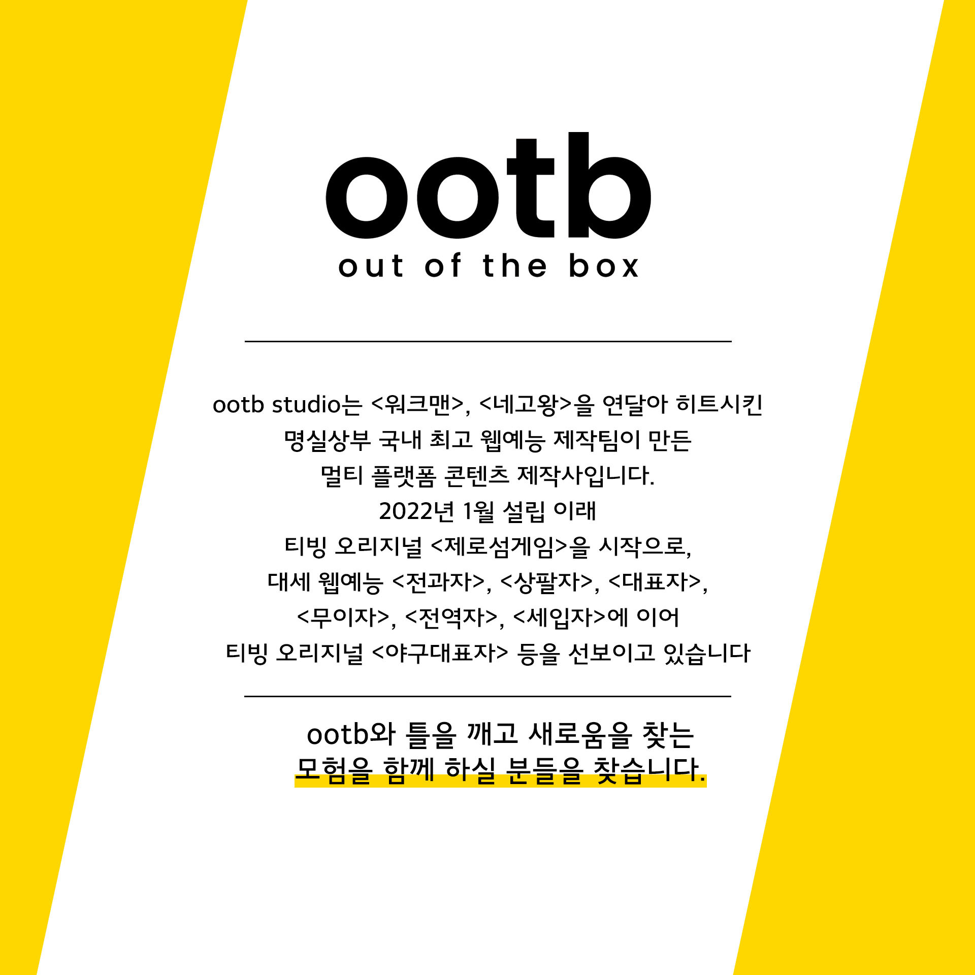 ootb의 사명은 ‘고정 관념에서 벗어나’, ‘독창적으로’라는 뜻인 동시에 우리 팀의 DNA를 담고 있는 ‘Out Of The Box’의 앞 글자를 따서 만들었습니다. 사명처럼 우리는 틀을 깨는 시각으로, 누구도 경험해 보지 못한, 신선한 콘텐츠를 만들고, 전혀 새로운 가치를 창출합니다.