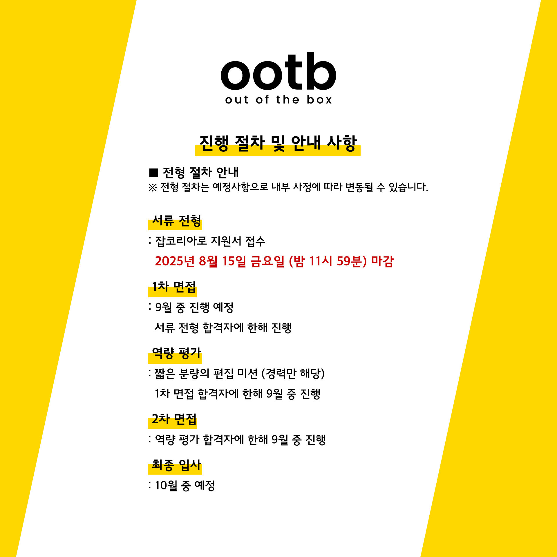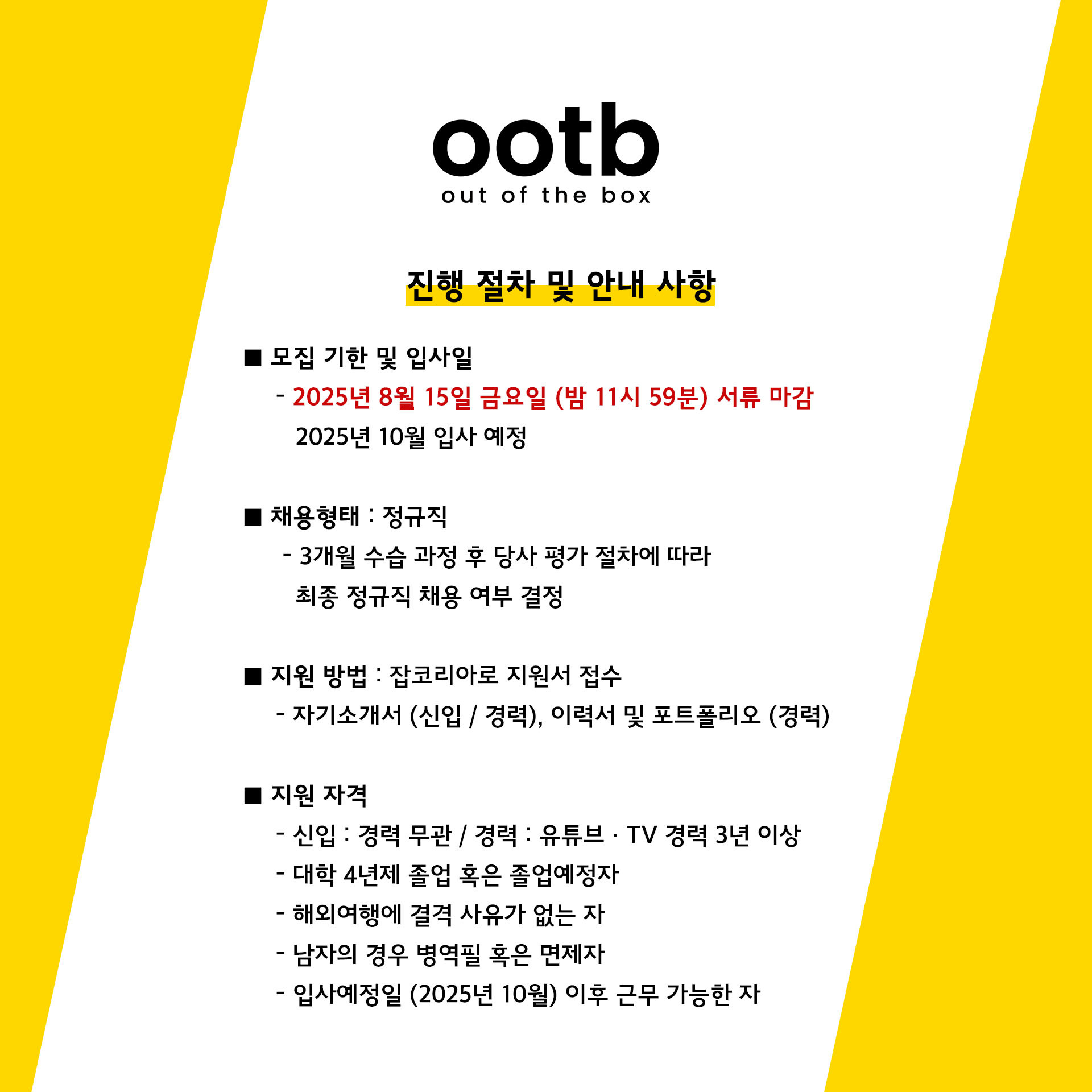 - 서류마감: 2025년 8월 15일 금요일 (23시 59분 마감) [잡코리아를 통해 지원]