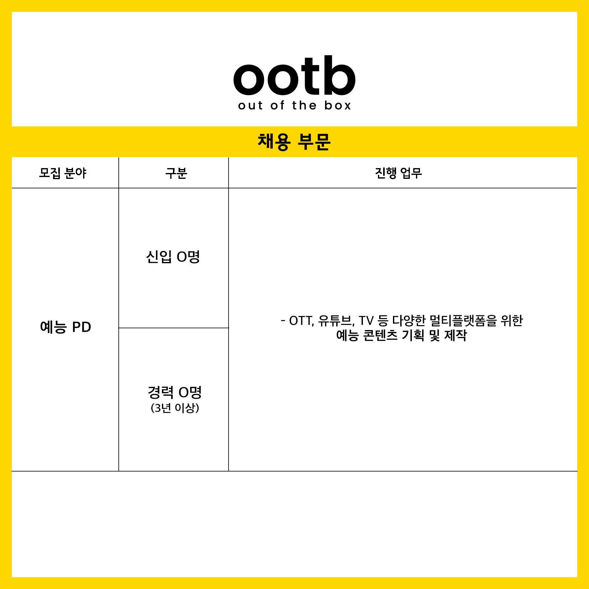 [ootb STUDIO] 오오티비 예능PD 모집(신입 / 경력 정규직 채용)