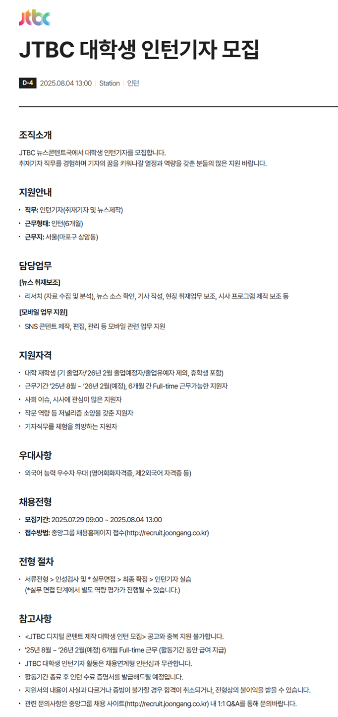 [[인턴]]JTBC 대학생 인턴기자 모집 작성자오늘도고마워용|작성시간25.07.31|조회수3,119 목록 댓글 0 글자크기 작게가 글자크기 크게가 JTBC 대학생 인턴기자 모집https://recruit.joongang.co.kr/jobnotice/detail.do?recSeq=3007 다음검색 현재 게시글 추가 기능 열기 북마크 공유하기 신고 센터로 신고 댓글 댓글 0 댓글쓰기 답글쓰기 댓글 리스트