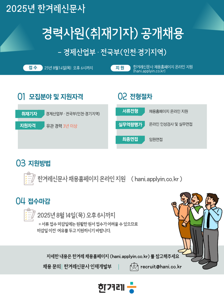 [[경력]][한겨레신문사] 2025년도 경력사원(취재기자) 공개채용 (~8.14(목)오후6시까지) 작성자🌿🌿🌿|작성시간25.08.08|조회수3,589 목록 댓글 0 글자크기 작게가 글자크기 크게가 ■ 지원서 제출: 한겨레 채용홈페이지 ( https://hani.applyin.co.kr ) 다음검색 현재 게시글 추가 기능 열기 북마크 공유하기 신고 센터로 신고 댓글 댓글 0 댓글쓰기 답글쓰기 댓글 리스트